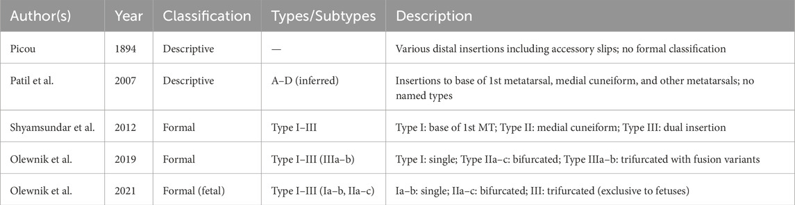 In a descriptive cadaveric study of 30 lower limbs, Patil et al. (2007) investigated the variability in the distal insertion of the FLT. They observed that while all specimens exhibited insertion to the base of the first metatarsal, a significant proportion also displayed additional slips to the medial cuneiform (86.6%) and accessory attachments near the first tarsometatarsal joint (30%). Further variations included slips to the second, fourth, and fifth metatarsals, as well as to the neck of the first metatarsal. Although no formal classification was proposed, their findings highlighted a wide range of insertional diversity, which holds clinical relevance, particularly in reconstructive procedures and imaging interpretation (Patil et al., 2007).