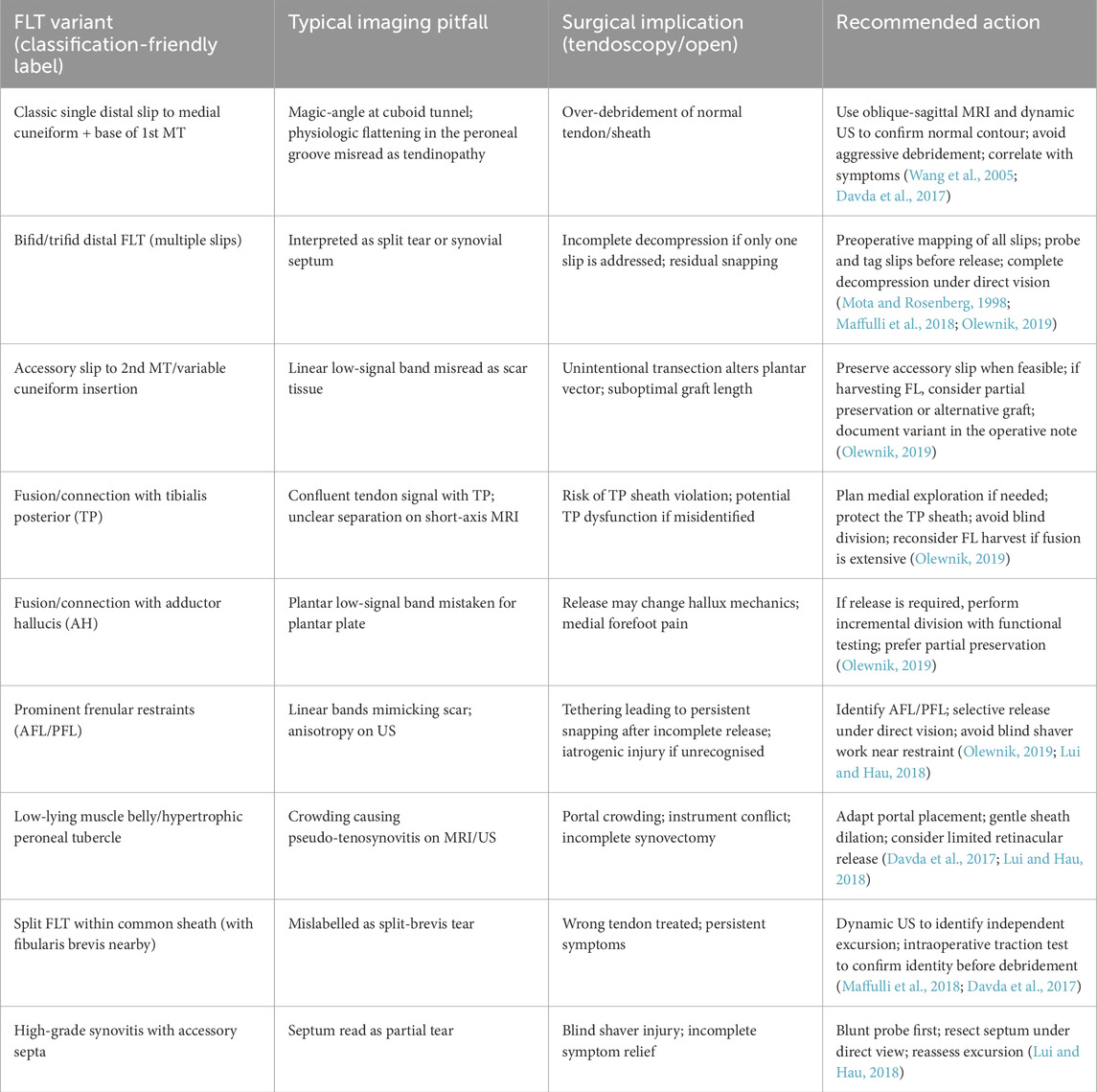 Third, clinical registries focusing on procedures involving the FLT such as tendon harvesting, tendoscopic decompression, or reconstructive transfers should be established. Subtype-stratified analyses could elucidate the impact of variant anatomy on postoperative outcomes, rehabilitation time, and risk of complications.