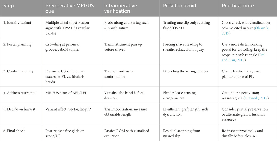 In summary, these variants reflect the morphological diversity of the fibularis longus muscle–tendon unit and should be recorded and interpreted within a structured anatomical framework. Clinical implications are summarised in Section 6; see Table 5 for variant-specific mapping and Table 6 for the intraoperative checklist.
