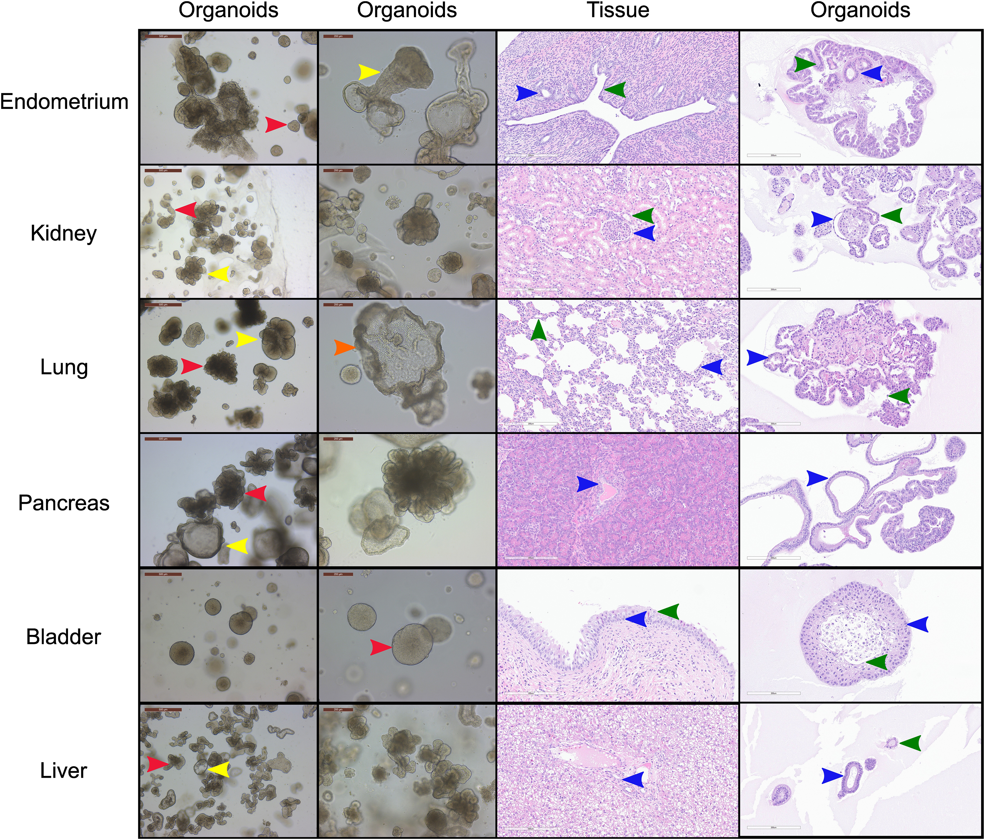 Figure 1. Morphological and histological characterization of canine organoid lines derived from a single donor. Brightfield and hematoxylin & eosin (H&E) images and approximate proportions of the cultures for the six organoid cell lines derived from the uterus (red = 80%, yellow = 20%), kidney (red = 40%, yellow = 60%), lung (red = 60%, yellow = 35%, orange = 5%), pancreas (red = 50%, yellow = 50%) and urinary bladder (red = 100%) of canine individual B816 prior to thawing. Red, yellow, and orange arrows indicate distinct morphologies in each organoid line while blue, green, and black arrows indicate similar histological areas of the organoids and tissues. Structures identified in tissues with histological similarities in organoids were found in endometrium (blue = glandular epithelial cells, green = endometrial epithelial cells), kidney (blue = parietal cells, green = distal tubule), lung (blue = cuboidal epithelial cells, green = alveolar type-1 cells), pancreas (blue = interlobular ducts), urinary bladder (blue = basal cells, green = umbrella cells), and liver (blue = cholangiocyte, green = other observed morphology) organoids. Brightfield images of organoid cultures were captured using a Leica Dmi1 microscope. H&E images were captured from whole image scanned slides using ImageScope software. Scale bars are provided in μm.