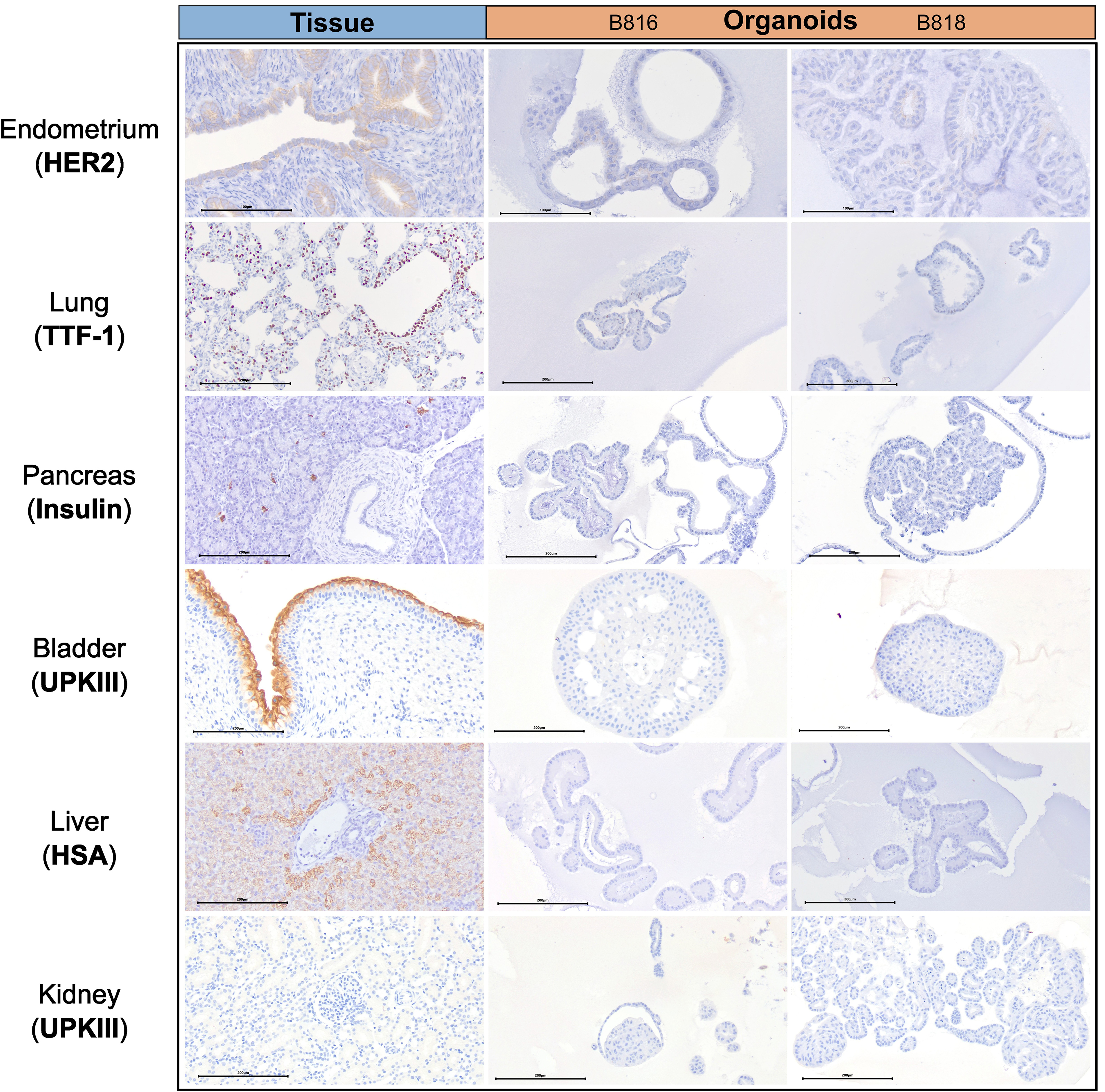 Figure 2. Immunohistochemistry comparison of tissues and organoids. Immunohistochemistry staining of a representative tissue and organoids from both donors, B816 and B818. Antibodies for HER2, TTF-1, Insulin, UPKIII, and HSA were used. Scale bars for each image are displayed in μm.