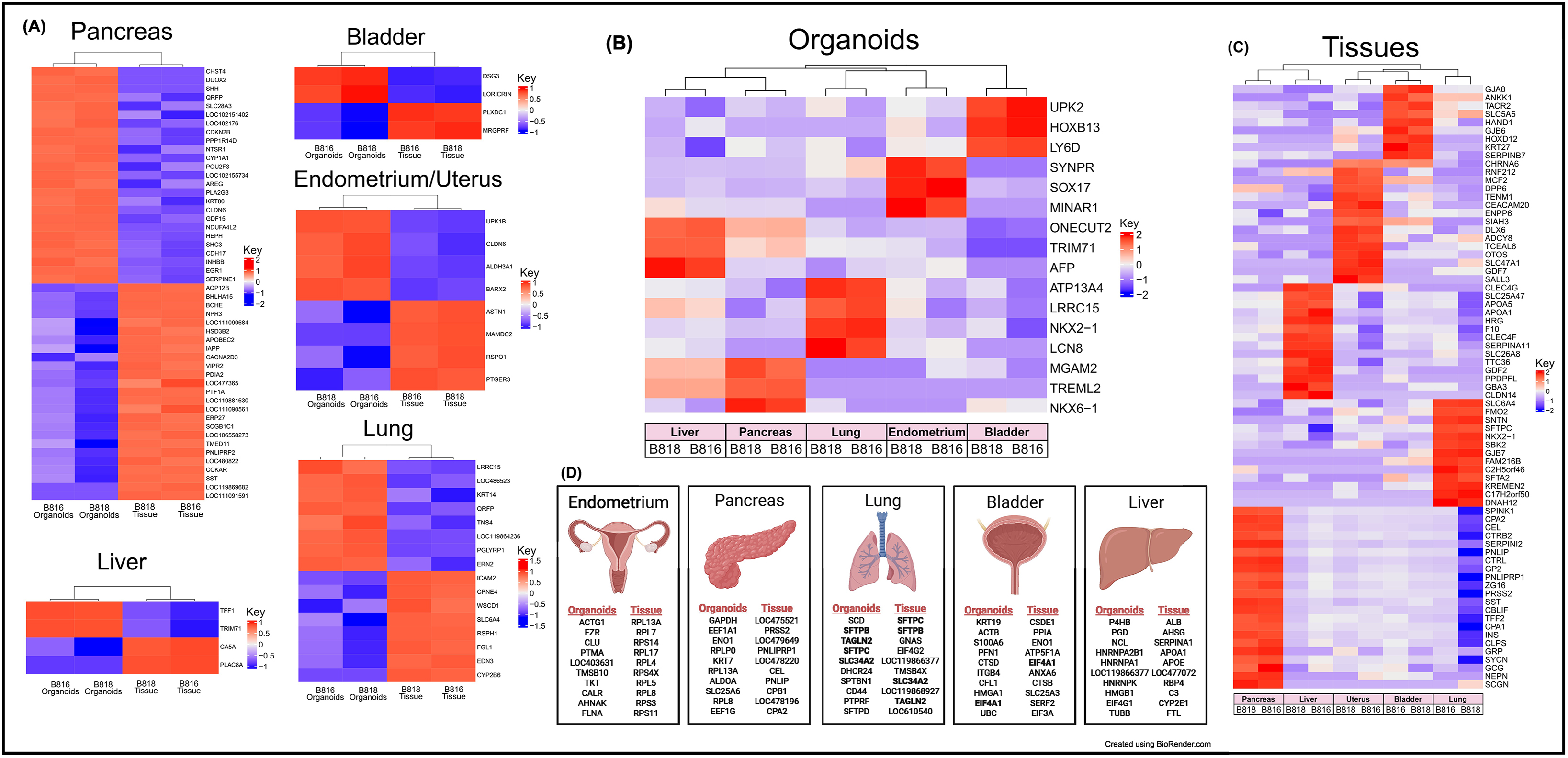 Figure 3. Expression of RNA and identification of tissue-specific markers for both organoids and tissues. (A) RNA heatmaps of the differentially expressed (DE) genes (FWER <0.05) between tissues and organoids of the same organs. Tissue-specific markers were identified across the five tissues for both (B) organoids (FWER <0.05) and (C) tissues (FWER <0.05). Upregulated expression is red, white is neutral, and blue represents suppressed expression. (D) The 10 most highly expressed tissue-specific genes from two genetically related donors for both organoids and tissues, as well as genes in common between organoids and tissues are denoted in bold.