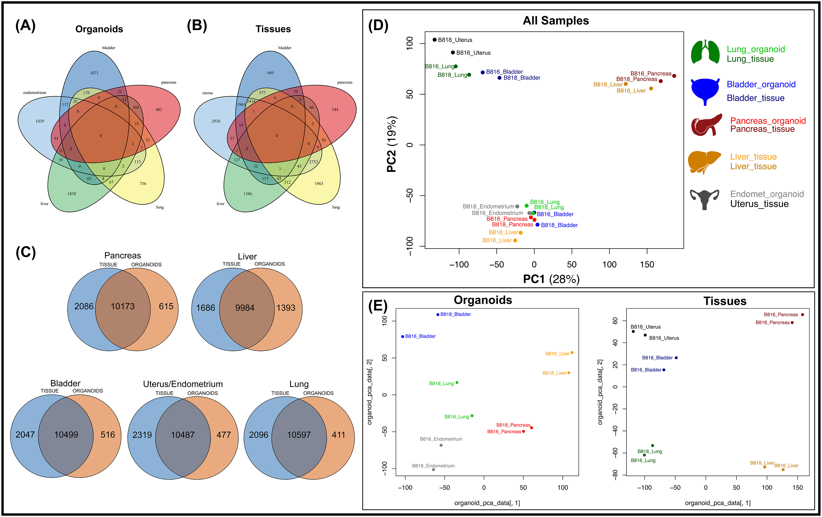 Figure 4. Comparison of mRNA expression similarity between organoids and tissue samples for each organ. Venn diagrams of genes expressed from both donors (B816 and B818) comparing (A) organoids and (B) tissues from the same organs. (C) Venn diagrams showing the comparison of mRNA expression between organoids and tissues from each organ. (D) Principal component analysis (PCA) plots of mRNA expression across all organoid and tissue samples. (E) PCA plots for either organoid or tissue samples. Tissue types are color coded in the legend.