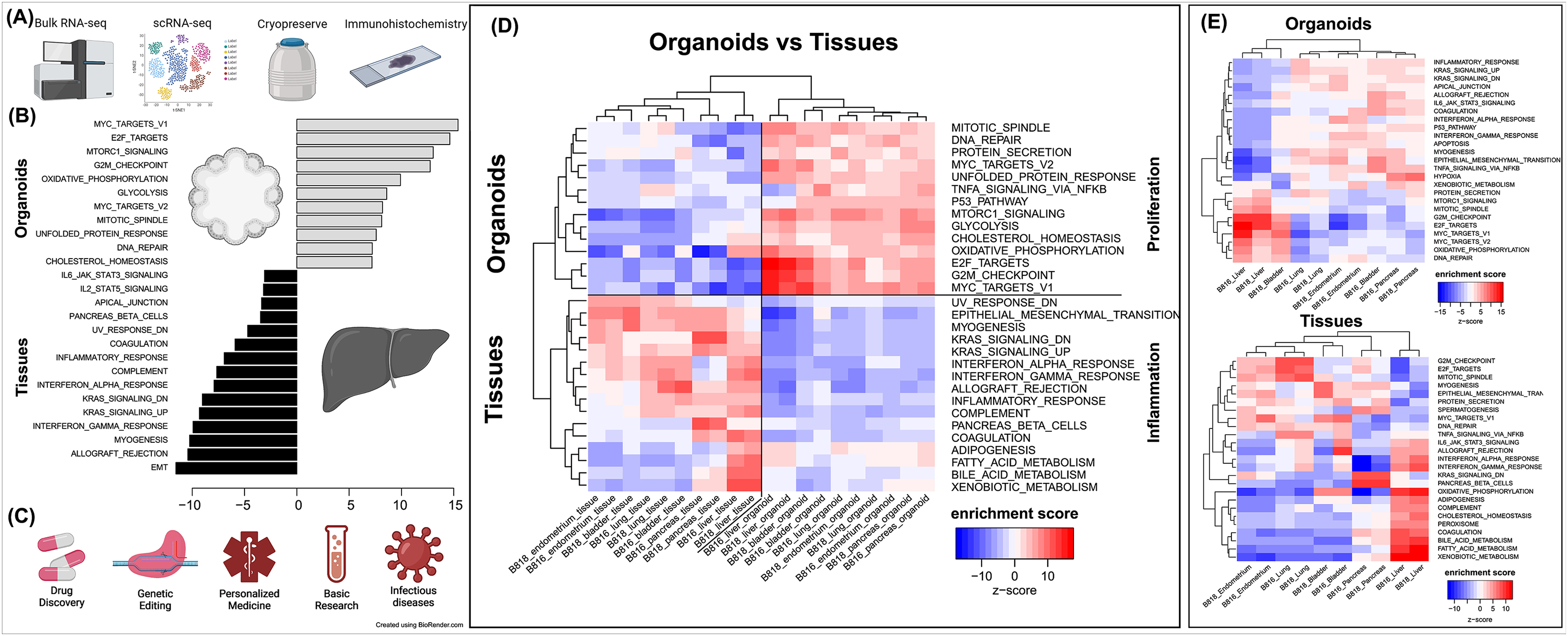 Figure 5. Characterization of organoids, pathway enrichment analysis, and potential biomedical applications. (A) Initial characterization and preservation methods used for the intra-donor derived canine organoid cell lines. (B) A list of the top pathways when comparing organoids to tissues. (C) A list of potential biomedical applications for canine organoid models. (D) Analysis of proliferation and inflammation pathways shown across all organoids and tissues. (E) Enriched pathways for either organoids or tissues (red = upregulated, blue = downregulated).