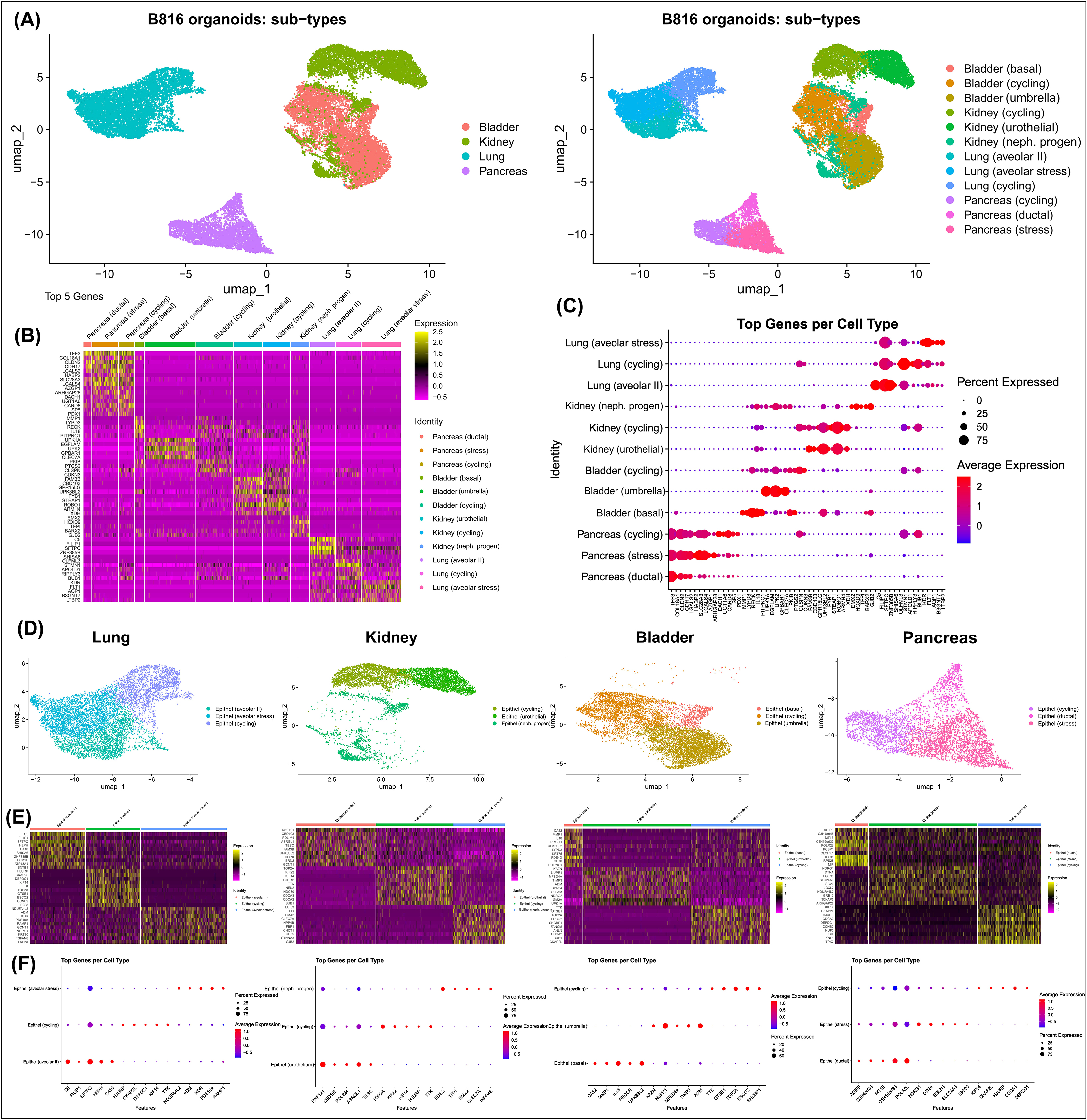 Figure 6. Identification of cell types present in organoids using scRNA-seq. Identification of cell clusters using scRNA-seq for canine organoids derived from the pancreas, kidney, lung, and urinary bladder after thawing. (A) Annotated UMAPs displaying the four organoid types compared, as well as the distinct cell clusters (colored) identified in canine organoids. (B) Heatmap identifying the top 5 markers for each cluster (upregulated = yellow and downregulated = pink, with respect to each other), expressed as average log2Fold Change. (C) Expression of the top 5 genes per cluster. The dot size depicts the percentage of cells in a class and dot color corresponds to the average expression level across all cells within a class (red = higher transcription, blue = lower transcription). (D) Annotated UMAPs displaying the four individual organoid types and their relevant cell clusters (colored). (E) Heatmaps identifying the genes expressed in each cluster. (F) Expression of the top 5 genes per cluster. The dot size depicts the percentage of cells in a class and dot color corresponds to the average expression level across all cells within a class (red = higher transcription, blue = lower transcription).