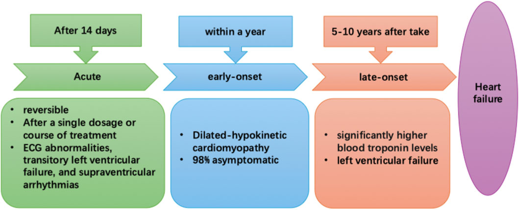 Anthracyclines also, by altering DNA structures and blocking their ability to interact with other proteins and enzymes, prevent cell division (Broder et al., 2008). Furthermore, they have been linked to the generation of reactive oxygen species (ROS) and inflammatory mediators; ROS, due to them inhibiting cardiomyocyte functions, have been considered to be the most likely agent behind the cardiotoxic effects, while inflammatory mediators are able to trigger cardiac cell death (Henriksen, 2018). With respect to cardiotoxicity, there are three types: acute, which occurs right after chemotherapy, early, occurring <1 year of therapy, and late, which takes place over several years. These three types were first discovered in 1980, and are summarized in Figure 1 (Zamorano et al., 2016): 1) Acute cardiotoxicity is often reversible, possibly even after a single dose or course of treatment, and symptoms generally appear 14 days after the conclusion of treatment, 2) Early-onset chronic cardiotoxicity manifests as dilated-hypokinetic cardiomyopathy, and progresses towards HF in <1 year, and 3) Late-onset chronic cardiotoxicity occurs multiple years post-anthracycline therapy.