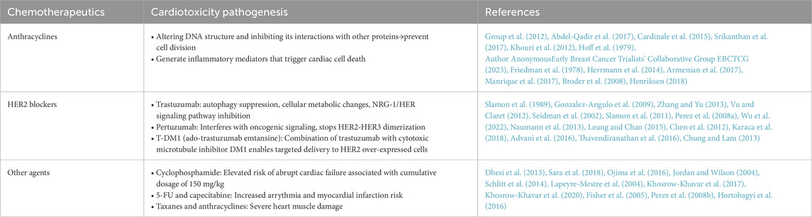Chemotherapy for breast cancer is primarily classified as adjuvant/neoadjuvant chemotherapy and metastatic treatment, depending on the disease stage and target. Adjuvant chemotherapy for early-stage breast cancer seeks to eradicate any remaining micrometastases following surgery, whereas neoadjuvant chemotherapy is used to reduce the tumor size in preparation for surgery or breast preservation. Chemotherapy is mostly palliative for metastatic breast cancer, with the goals of controlling the illness, reducing symptoms, and extending survival (Guidelines Presidium Lecture Tour, 2022). Cancer molecular typing is used to choose chemotherapy medications. The mainstays of treatment for HER2-negative breast cancer are taxanes (paclitaxel and docetaxel) and anthracyclines (doxorubicin and epirubicin), which are frequently administered one after the other or in combination (Group et al., 2012). Chemotherapy and HER2 blockers (such trastuzumab and pertuzumab) are the usual treatment for HER2-positive breast cancer since they greatly enhance prognosis (von Minckwitz et al., 2017). Platinum-based medications (such carboplatin) have shown exceptional success for triple-negative breast cancer or certain situations (Tutt et al., 2021). Furthermore, the therapeutic landscape has been transformed by antibody-drug conjugates (such T-DM1 and DS-8201) can precisely deliver extremely potent cytotoxic medications to cancer cells (Modi et al., 2020). The following will elaborate on various chemotherapy drugs and their effects on cardiotoxicity.