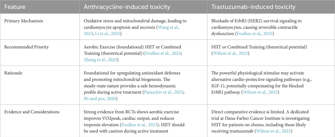 Exercise training may also affect cardiomyocyte metabolism through adenosine monophosphate-activated protein kinase (AMPK). PAK1 is activated by various cell surface or intracellular signals, activates the MAPK signal pathway, changes the shape of the cytoskeleton and acts as an oncogene in breast cancer (Torun et al., 2024). Kitani et al. found that in human induced pluripotent stem cell-derived cardiomyocytes (iPSC-CMs) treated with trastuzumab, the pharmacological activation of AMPK promoted glucose absorption, improved mitochondrial respiratory capacity and systolic dysfunction (Kitani et al., 2019), This is also in line with the view of Coven et al., who observed that the increase in AMPK activity was a prominent cardiac adaptation related to exercise in rats (Coven et al., 2003). Based on those findings, exercise could potentially alleviate TIC-linked metabolic impairments and subsequent contractile dysfunction, by increasing AMPK activation. Aside from increased AMPK activity, AE has been found in rodents to upregulate Pparg coactivator (PGC)-1α, a critical mitochondrial biogenesis regulator, whose activity is hampered in trastuzumab-treated iPSC-CMs (Kitani et al., 2019); indeed, rats who underwent vigorous exercise had a 37% increase in mitochondrial density, and 44% increase in cardiac PGC-1α (Tam et al., 2015). Similar benefits, along with that of enhanced mitochondrial capacity, fatty acid oxidation, and glycogen production (Riehle et al., 2014) were also observed in other animal exercise models (Vettor et al., 2014). Based on these findings, even small amounts of exercise could alleviate pathogenic cardiac remodeling, via counteracting the proinflammatory effects of trastuzumab; this was demonstrated in a rat myocardial infarction-induced HF model, where AE reduced plasma tumor necrosis factor-α and IL-6 (Nunes et al., 2013). Anthracyclines mainly induce cardiotoxicity by damaging mitochondria and causing oxidative stress, which results in the death of cardiomyocytes (Narezkina et al., 2021). This major damage mechanism is directly countered by exercise-induced AMPK activation, which aids in restoring redox equilibrium (the cellular balance between oxidants and antioxidants). Moreover, PGC-1α activation is a master regulator of mitochondrial biogenesis, which is the process by which new, healthy mitochondria are created (Taha et al., 2025). The main cause of trastuzumab’s cardiotoxicity is not oxidative stress. Instead, it includes cardiomyocytes’ HER2 signaling being blocked, which is essential for their survival and ability to contract. Unlike anthracycline toxicity, which is dose-dependent, this kind of damage is frequently reversible (Taha et al., 2025).