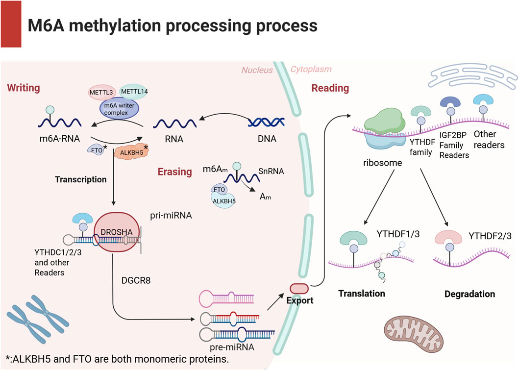 The writers recognize and bind to m6A-modified RNA, regulating mRNA stability, translation efficiency, splicing, and nuclear export. This group primarily includes the methyltransferase-like proteins methyltransferase-like 3 (METTL3),METTL14 and Wilms’ tumor 1-associating protein (WTAP). Within this complex, METTL3 serves as the catalytic subunit, while METTL14 provides structural support at the active site (Wang et al., 2016). The readers decode the m6A marks and regulate mRNA metabolism through distinct mechanisms. Key examples include YTH domain-containing family proteins (YTHDF1-3 and YTHDC1-2) and eukaryotic translation initiation factor 3 subunit A (eIF3), which recognize m6A sites to modulate target RNA function. The erasers remove m6A modifications from RNA (32), dynamically controlling modification levels and participating in cell development and stress responses. Major erasers include fat mass and obesity-associated protein (FTO) and alkB homolog 5 (ALKBH5), which mediate m6A demethylation (Kapadia et al., 2025).