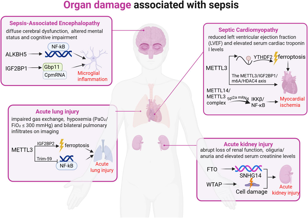 Figure 2. Organ damage associated with sepsis. Severe sepsis is frequently accompanied by organ damage, primarily involving injury to the heart, lungs, kidneys, and brain. Research indicates that sepsis-induced organ damage is driven by aberrant RNA modifications and their regulatory factors, manifested as endothelial cell injury and ferroptosis. The figure above illustrates the role of m6A modification in organ damage during sepsis.