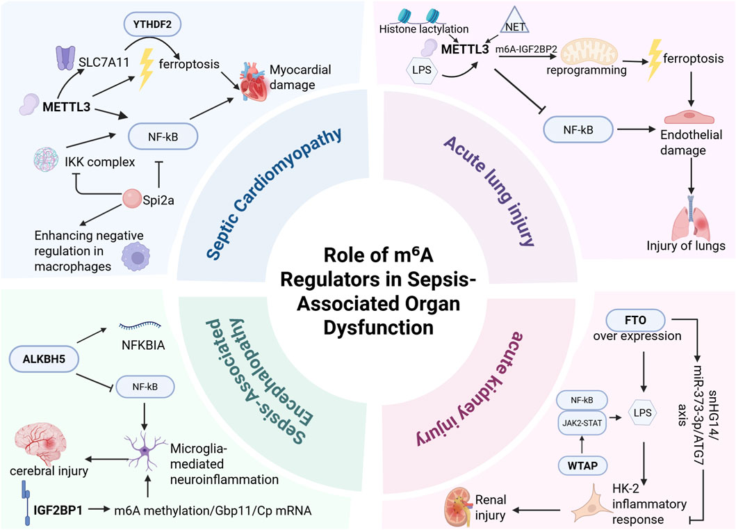 Sepsis-induced multi-organ injury involves complex pathogenic networks. This review has examined mechanisms underlying sepsis-mediated organ damage and delineated the regulatory roles of m6A methylation: Writer, Eraser, and Reader proteins participate dynamically in critical biological processes by post-transcriptionally modulating cellular gene expression, thereby propagating secondary organ injury. These modifications influence RNA fate through splicing, transport, translation, stabilization, and degradation, profoundly impacting sepsis progression.