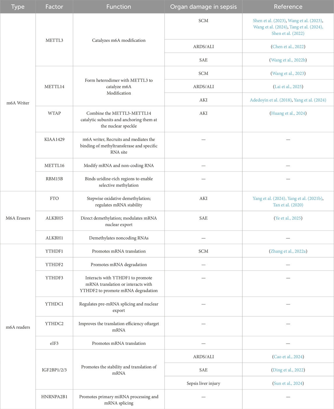 MODS represents a severe dysregulated systemic inflammatory state triggered by sepsis, and is characterized by progressive functional deterioration or failure of two or more vital organ systems (Shi et al., 2019) (e.g., heart, lungs, kidneys). As the terminal stage of sepsis, MODS carries a mortality rate of 28%–56% upon diagnosis (Zou et al., 2022). Emerging evidence indicates that m6A methylation modulates sepsis progression through multiple pathways, playing a pivotal role in MODS development (Shen et al., 2023; Zhang S. et al., 2022) (Figure 3). Consequently, elucidating m6A’s functions in sepsis-induced organ dysfunction is crucial for optimizing clinical management and developing novel therapeutics.
