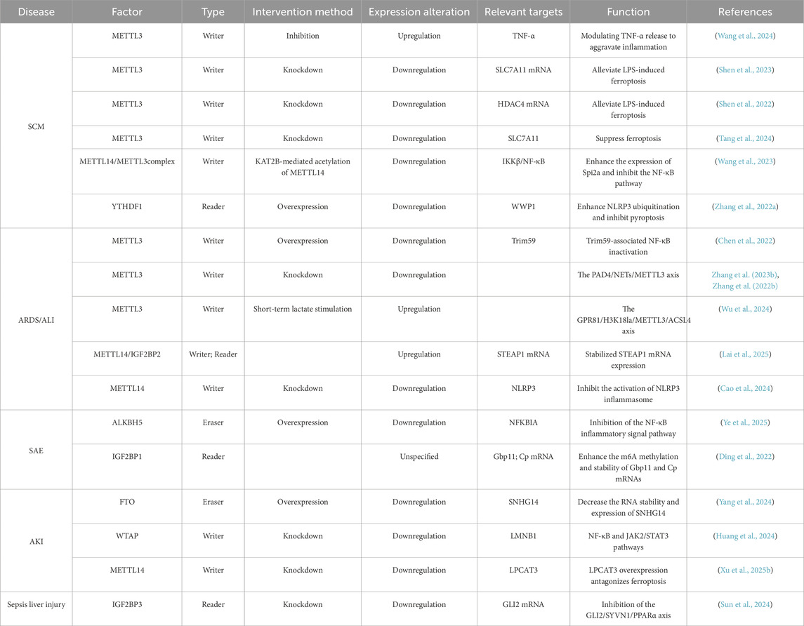 The liver critically regulates systemic immune responses during sepsis by means of bacterial clearance, cytokine production, and metabolic adaptations to inflammation (Sun et al., 2020). However, sepsis-induced ischemic hepatic injury, shock-related damage, and secondary sclerosing cholangitis collectively establish the liver as a primary target of sepsis-mediated secondary injury (Strnad et al., 2017). As an independent predictor of ICU outcomes, identifying therapeutic targets for septic liver injury is imperative (Wang et al., 2025). Sun et al. demonstrated that in septic mice,IGF2BP3 interacts with GLI family zinc finger 2 (GLI2) mRNA to stabilize m6A-modified transcripts. Upregulated Gli2 transcriptionally promotes synoviolin 1 (Syvn1) expression, which subsequently enhances degradation of peroxisome proliferator-activated receptor alpha (PPARα). This cascade ultimately exacerbates septic liver injury both in vitro and in vivo by suppressing PPARα-mediated autophagy, establishing the IGF2BP3/GLI2/Syvn1/PPARα axis as a potential therapeutic target (Sun et al., 2024).