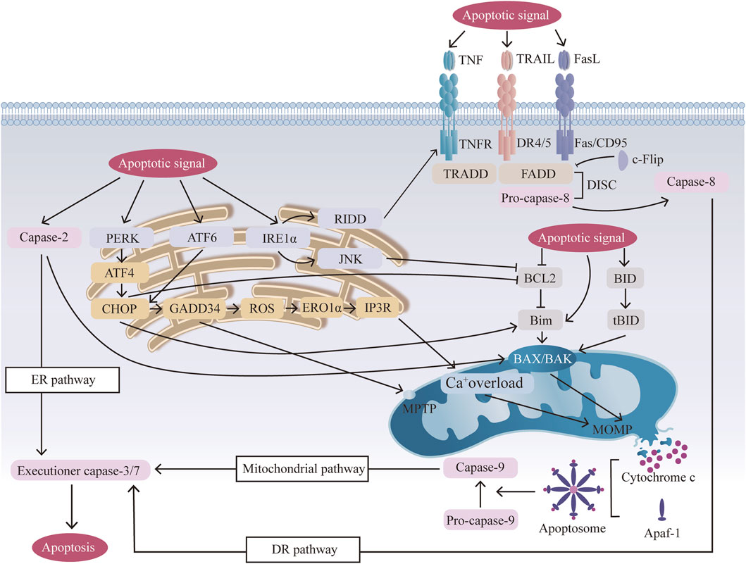 Figure 1. Mechanisms of three apoptotic pathways: the mitochondrial pathway, the (endoplasmic reticulum) ER pathway, and the (death receptor) DR pathway. Mitochondrial pathway: apoptotic signals activate BCL2 family members, and activated BAX/BAK undergoes oligomerization, forming BAX/BAK pores in the mitochondrial membrane, releasing CYCS, and then forming apoptosomes, which activate caspase 9 and induce apoptosis. Mitochondrial Ca+ overload and mitochondrial permeability transition pore (MPTP) opening further amplify this signal. ER pathway: ER stress from cellular stressors activates sensors (activating transcription factor 6 (ATF6), inositol-requiring enzyme (1αIRE1α), and protein kinase RNA-like ER kinase (PERK)), leading to C/EBP-homologous protein (CHOP) activation, mitochondrial dysfunction, and apoptosis. CHOP mediates ER-mitochondrial crosstalk by suppressing BCL2 and activating BIM, thereby forming a positive feedback loop that amplifies BAX/BAK oligomerization. ER stress also causes calcium release, contributing to mitochondrial calcium overload and apoptosis. DR pathway: Activation of death receptors (Fas, TNF-related apoptosis-inducing ligand (TRAIL) receptors, DR4/5) by their ligands (FasL, TRAIL, TNF) results in the formation of the death-inducing signaling complex (DISC), which activates caspase 8 and triggers apoptosis via direct cleavage of downstream executioner caspases. BH3-interacting domain death agonist (BID) cleavage amplifies this pathway by activating BAX/BAK and the mitochondrial pathway.