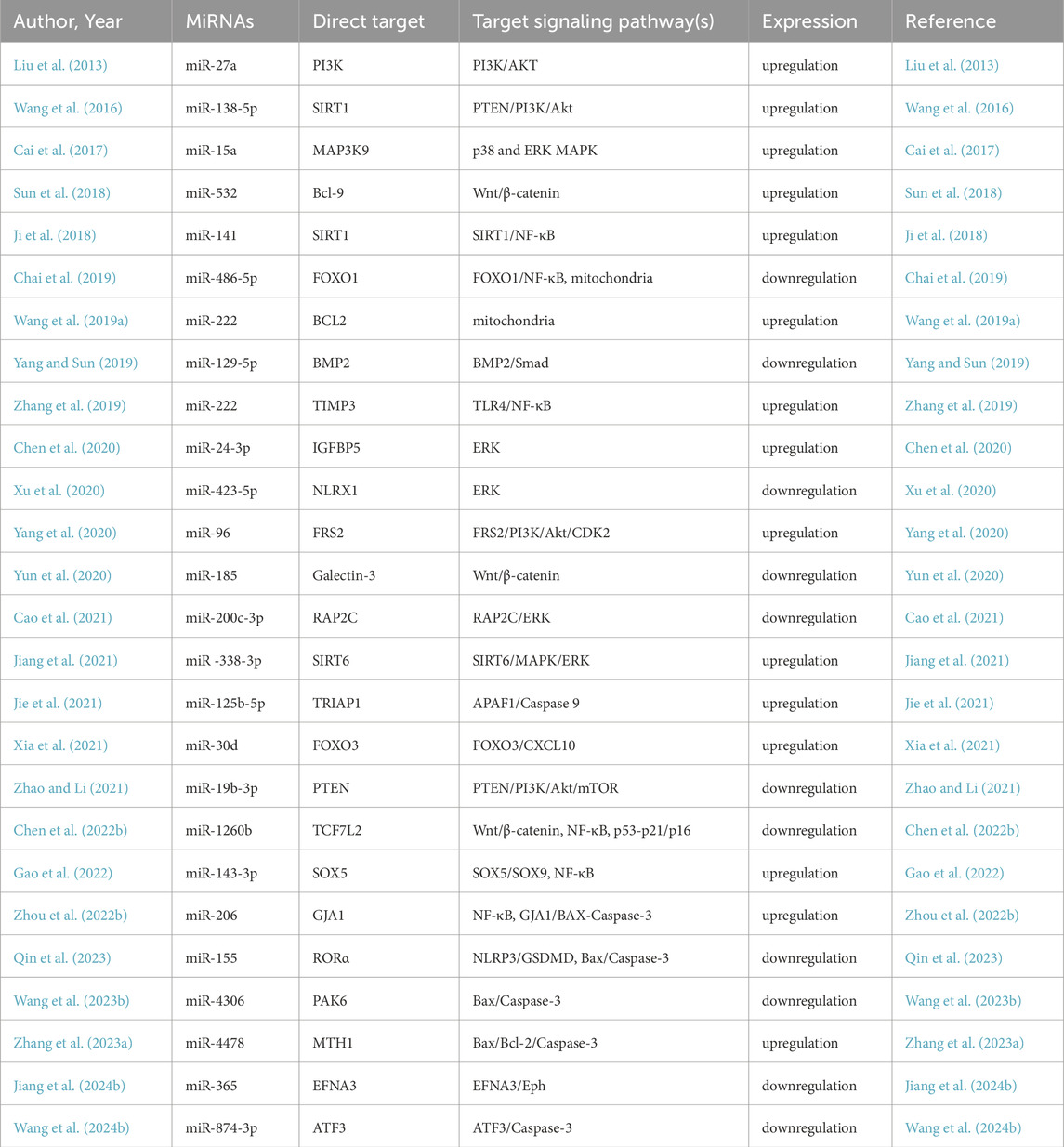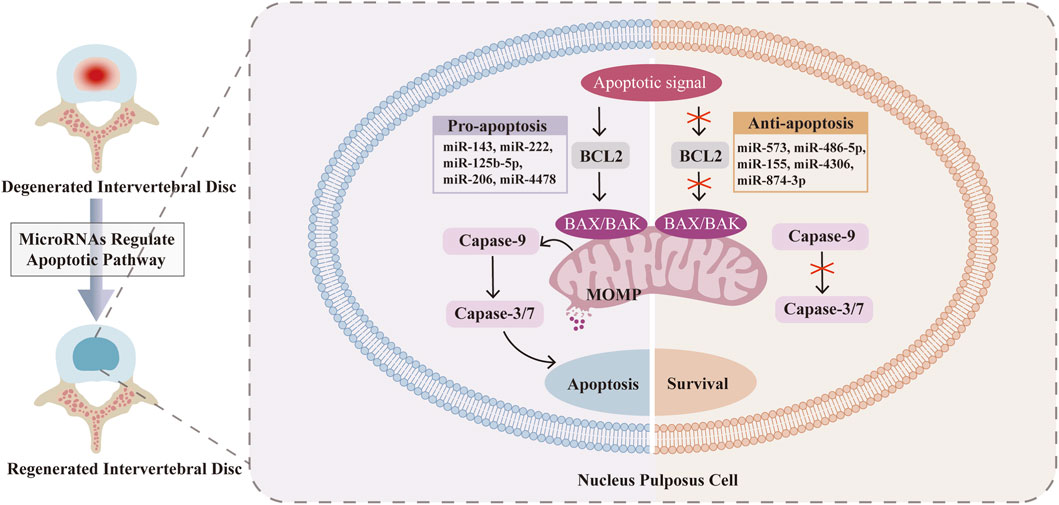 The intervertebral disc (IVD) is crucial for spinal biomechanics but is prone to degeneration. The process of IDD is an aberrant, cell-mediated response to progressive structural failure that is inextricably associated with the death of IVD cells. IDD initiates NPC apoptosis and progressively affects adjacent tissues (Vergroesen et al., 2015). Since the apoptosis of NPCs plays a crucial role in IDD, a better understanding of their intrinsic and extrinsic signaling pathways may lead to the exploration of promising potential therapeutic targets. Current clinical therapeutic methods have many limitations and cannot reverse the IDD. Conservative treatment can alleviate only clinical symptoms, and most patients ultimately require surgical intervention (Gugliotta et al., 2016). Neither minimally invasive surgery nor traditional surgery can overcome the risks of surgical injury, postoperative recurrence, accelerated degeneration, uncertain long-term efficacy, and other problems (Xie et al., 2020). Furthermore, no current therapeutic approach directly targets the molecular mechanisms driving IDD progression, leaving an urgent need for innovative and effective treatment strategies to alleviate patient suffering and reduce the socioeconomic burden. Gene therapy can reverse the process of IDD by inducing changes in intradiscal gene expression, and therapeutic genes are specifically designed and delivered to specific target sites. MicroRNAs (MiRNAs), short noncoding RNAs that regulate gene expression, originating from pri-miRNA transcription, has shown great potential for disease therapy (Wang T. J. et al., 2024). Different kinds of miRNAs are involved in extracellular matrix (ECM) degeneration, apoptosis, inflammation and mechanobiology, indicating that miRNAs play important roles in the pathology of IDD (Ohrt-Nissen et al., 2013). Recent breakthroughs in miRNA-based gene therapy, including the anti-apoptotic effects and the stronger effects result from the interaction with other molecules in the pathway, demonstrate their significant therapeutic potential in reversing IDD progression and restoring disc integrity.