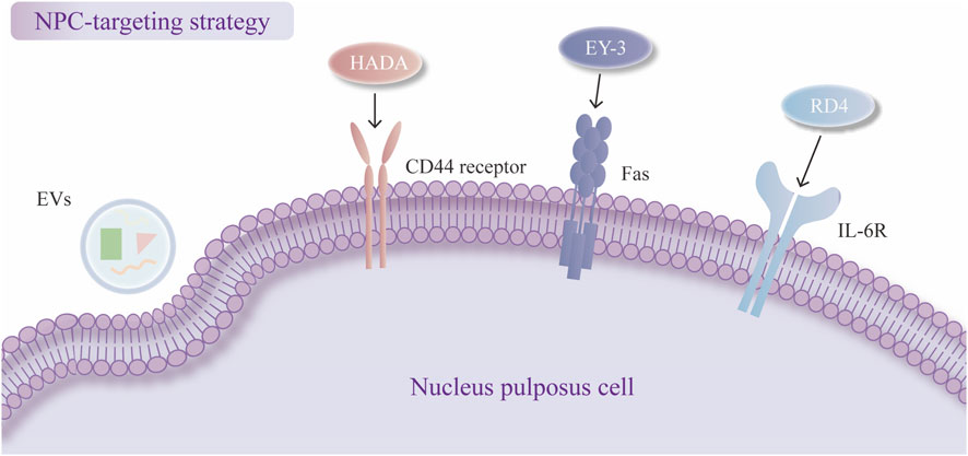 Figure 3. Nucleus pulposus cell (NPC)-targeting strategies. Cellular uptake of exosomes (EVs). Dopamine-grafted hyaluronic (HADA) binds to CD44. EY-3 binds to FasL. RD4 binds to IL-6R.
