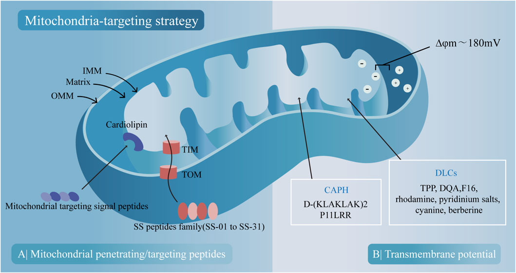 Figure 4. Two main mitochondria-targeting strategies and their corresponding compounds. (A) Peptides with mitochondrial-penetrating sequences penetrate mitochondria through outer mitochondrial membrane (OMM) and bind to cardiolipin on the inner mitochondrial membrane (IMM). Peptides with mitochondrial-targeting sequences are imported into mitochondria via translocase of the outer membrane (TOM) and TIM translocase of the inner membrane (TIM) channels. (B) Mitochondrial uptake of cationic amphiphilic polyproline helix (CAPH) and delocalized lipophilic cations (DLCs) occurs based on the transmembrane potential.