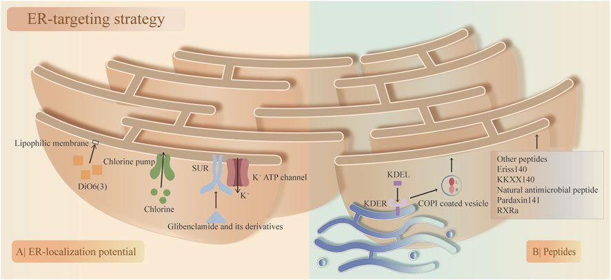 Figure 5. Two main endoplasmic reticulum (ER)-targeting strategies and their corresponding compounds. (A) ER-localization potential. The specific interaction between the sulfonylurea ligand (glibenclamide and its derivatives) and the ATP-sensitive K+ channel (SUR; sulfonylurea receptor) on the ER membrane and the chlorine group binding to the chlorine pump on the ER membrane. High concentrations of 3,3′-diethyloxycyanine iodine (DiOC6(3)) accumulate on the ER membrane. (B) Peptide signals. KDEL binds to KDELR on the Golgi apparatus, followed by retrograde transport to the ER via coat protein complex (COP I)-coated vesicles, where the ligand‒receptor complex is dissociated. Other peptides that target the ER membrane.