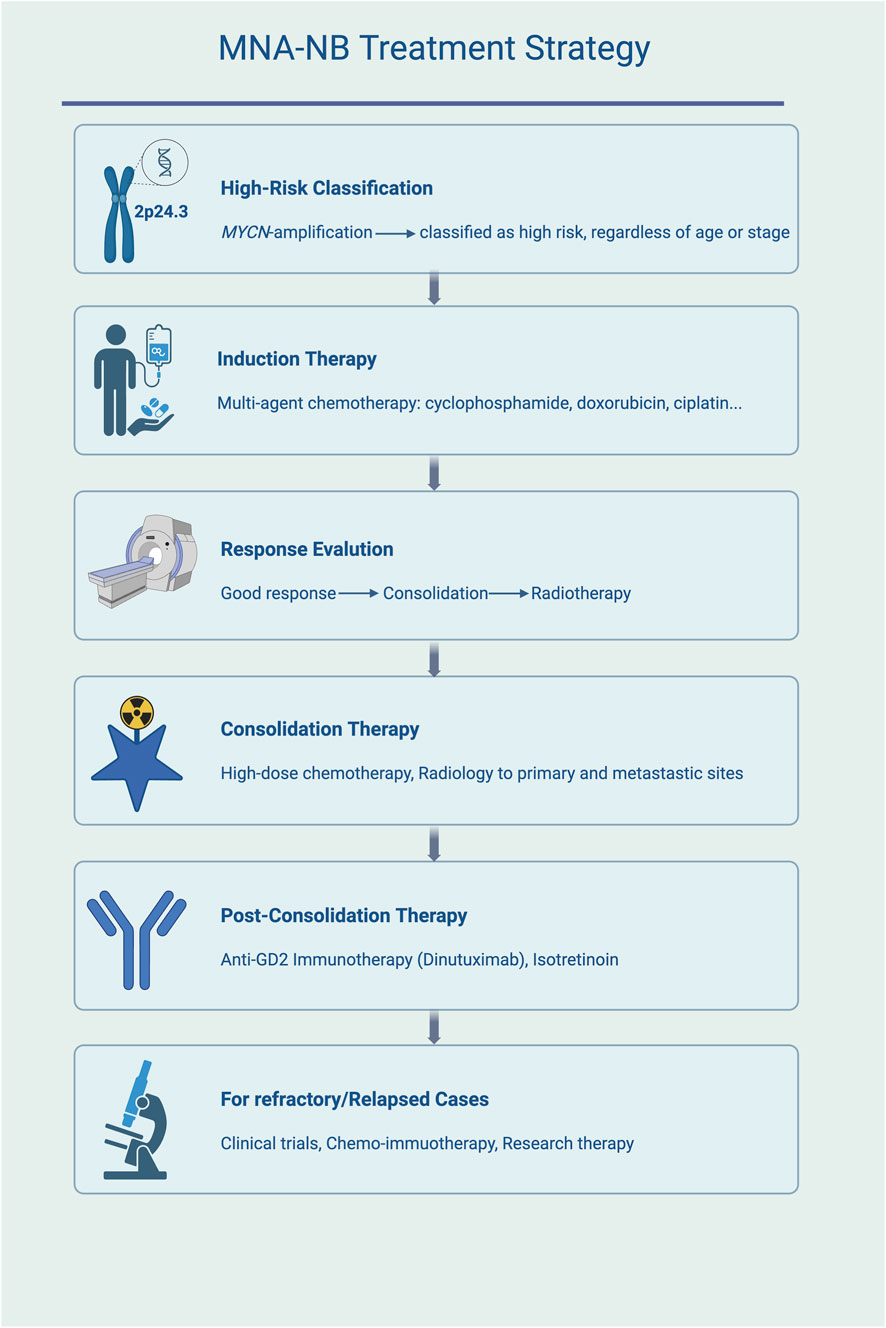 Figure 1. Treatment algorithm for MNA-NB. High-risk classification is assigned to all cases with MYCN amplification. Standard management includes induction chemotherapy, consolidation with high-dose chemotherapy and radiotherapy, post-consolidation anti-GD2 immunotherapy and isotretinoin, and experimental approaches for refractory or relapsed disease.