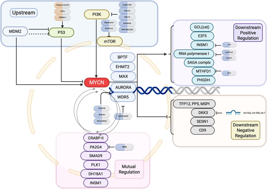 Figure 2. Upstream and downstream regulatory network of MYCN in neuroblastoma. Key upstream pathways, mutual regulators, and downstream positive and negative effectors of MYCN are shown, along with representative small-molecule inhibitors targeting each node.