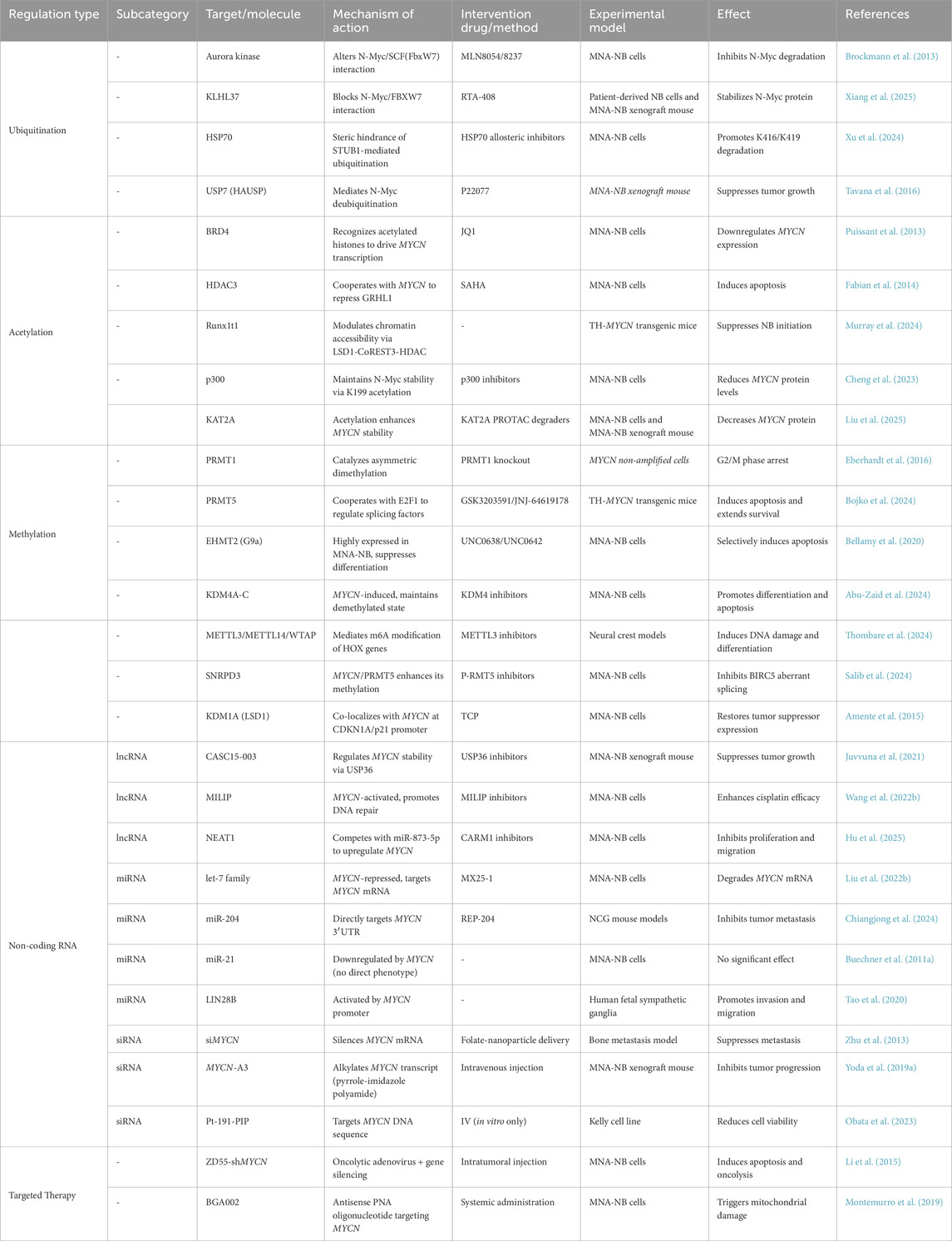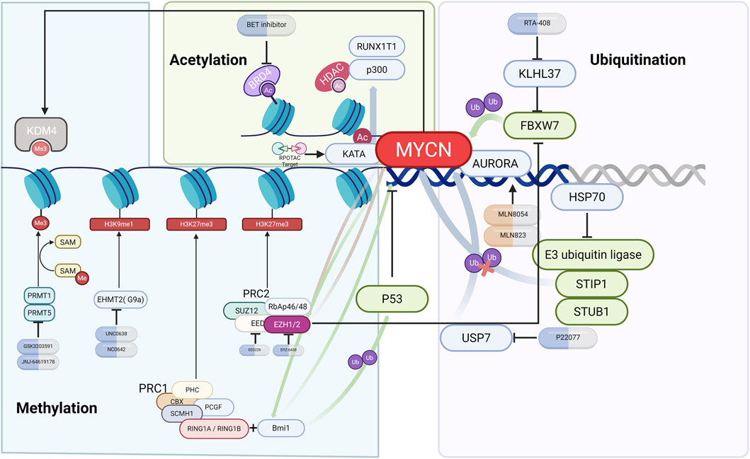 Cortés et al. reported that the HDAC inhibitor suberoylanilide hydroxamic acid (SAHA) induced apoptosis in all NB cell lines (regardless of MYCN status) and reduced MYCN expression, but changes in MYCN expression levels did not affect the efficacy of SAHA (Cortés et al., 2015). HDAC3 synergizes with MYCN to repress Grainyhead-like 1 (GRHL1) gene transcription, and GRHL1 overexpression inhibits the proliferation and in vivo growth of MNA-NB, suggesting that GRHL1 is a potential therapeutic target for HDAC inhibitors vorinostat (SAHA) or panobinostat (LBH589) (Fabian et al., 2014). Through large-scale mutagenesis screening, Murray et al. reported that knocking out Runx1t1 can prevent the occurrence of neuroblastoma in transgenic mice. Although no direct interaction between Runx1t1 and MYCN has been detected, the RUNX1T1 protein, a component of the LSD1-CoREST3-HDAC inhibitory complex, may inhibit the growth of NB with high MYCN expression by regulating chromatin accessibility through the inhibitory effect of the complex in the enhancer region (Murray et al., 2024). Cheng et al. identified 16 posttranslational modification sites and 114 interacting proteins through N-Myc coimmunoprecipitation and mass spectrometry analysis and reported that p300 maintains its stability by regulating the acetylation/ubiquitination of the N-Myc K199 site, suggesting that p300 is a potential target for N-Myc-targeted therapy (Cheng et al., 2023). Whole-genome sequencing of IMR32 cells revealed that N-Myc recruits the transcriptional coactivator KAT2A to bind to DNA, promoting the expression of genes related to ribosome biogenesis and RNA processing, whereas KAT2A increases the stability of N-Myc through acetylation. Moreover, PROTAC-mediated KAT2A degradation can reduce N-Myc levels (Liu et al., 2025).