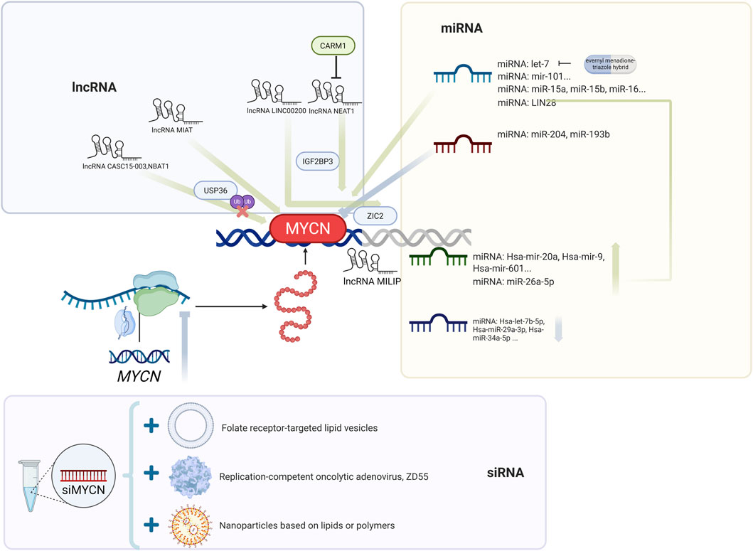 Figure 4. Post-transcriptional regulation of MYCN by noncoding RNAs. Schematic overview of MYCN regulation through lncRNAs (e.g., CASC15-003, NBAT1, MIAT, LINC00200, NEAT1, MILIP), miRNAs (e.g., let-7 family, miR-204, miR-193b), and siRNA-based strategies. Representative approaches such as miRNA mimics, siMYCN, antisense oligonucleotides (BGA002), and nanoparticle-mediated delivery are highlighted.