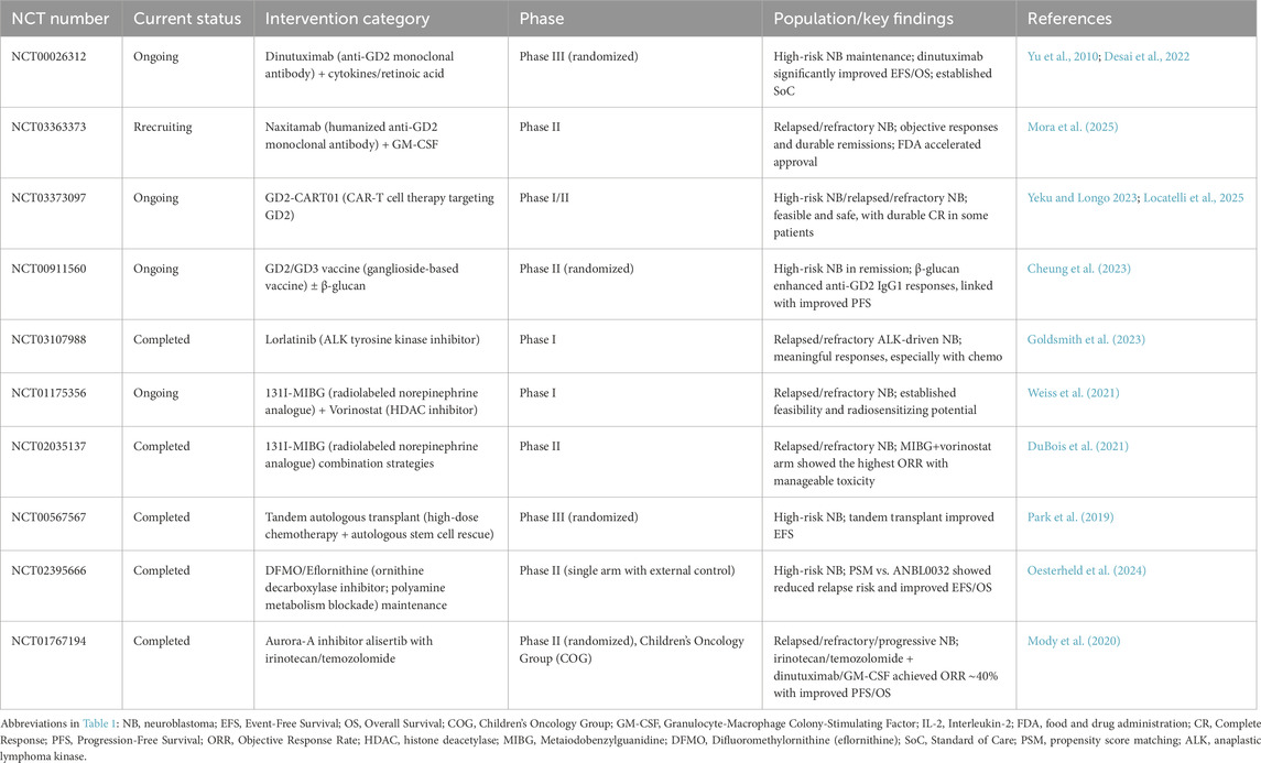 To highlight translational relevance, Table 1 summarizes representative clinical trials in neuroblastoma, including ongoing and completed studies with different treatment strategies. Figure 1 presents the treatment algorithm for MNA-NB (Figure 1; Table 1).