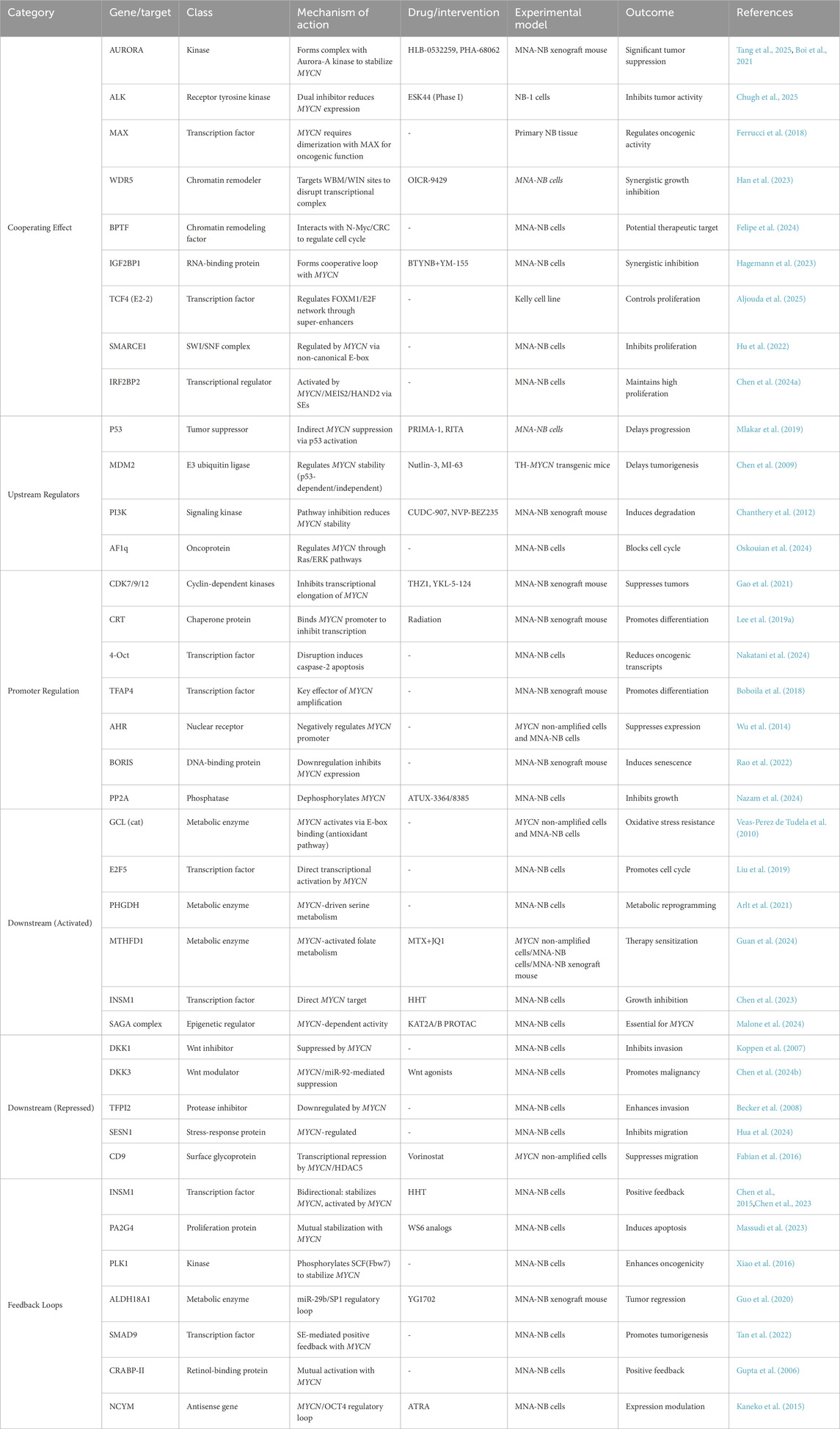 While all MNA-NB are classified as high-risk neuroblastomas, there is still a lack of treatment options that directly target MYCN due to an insufficient understanding of the structure of the N-Myc protein (Bell et al., 2010; Wolpaw et al., 2021). Therefore, many studies have focused on the MYCN gene and its transcriptional regulatory products, as well as the interactions between MYCN and other genes and proteins, to identify new strategies for the treatment of MNA-NB. This review summarizes the current research progress of therapeutics that indirectly target MYCN for the treatment of neuroblastomato provide new ideas for the treatment of MNA-NB and other MYCN-amplified tumors. Figure 2 and Table 2 provide an overview of the MYCN regulatory network, including its upstream regulators, cooperating partners, downstream positive and negative targets, and mutual adjustment loops (Figure 2; Table 2).