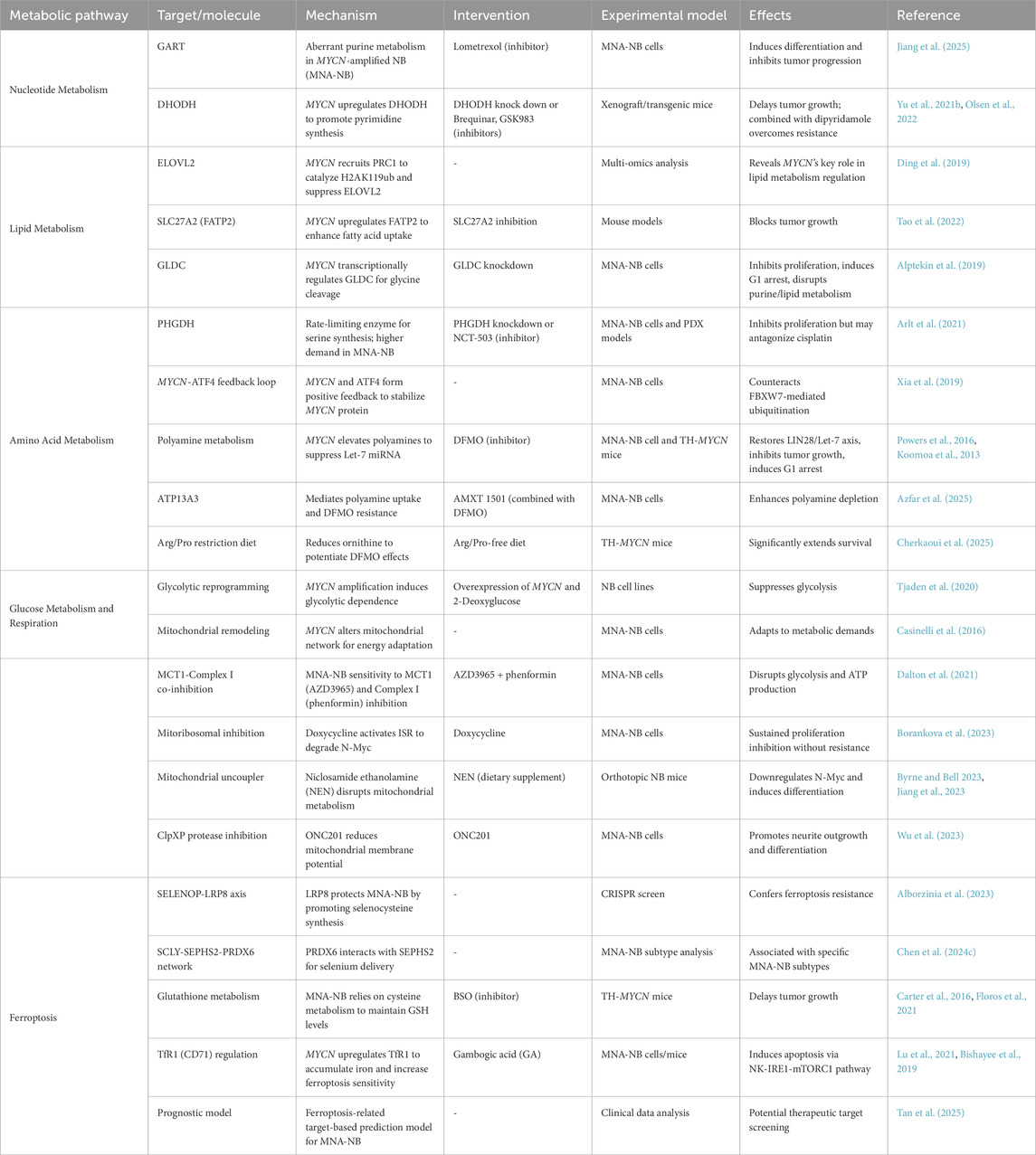 MYCN amplification drives profound metabolic reprogramming in NB, creating vulnerabilities across nucleotide, lipid, amino acid, glucose, and ferroptosis pathways. Through combined metabolome‒transcriptome analysis, Du et al. reported that, compared with non-MNA-NBs, MNA- NBs presented three abnormal pathways related to glycerolipid metabolism, purine metabolism, and lysine degradation, which can serve as potential therapeutic targets (Du et al., 2024). The following section summarizes MYCN-related metabolic targets (Table 4).