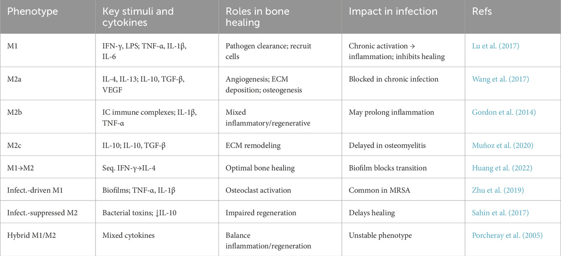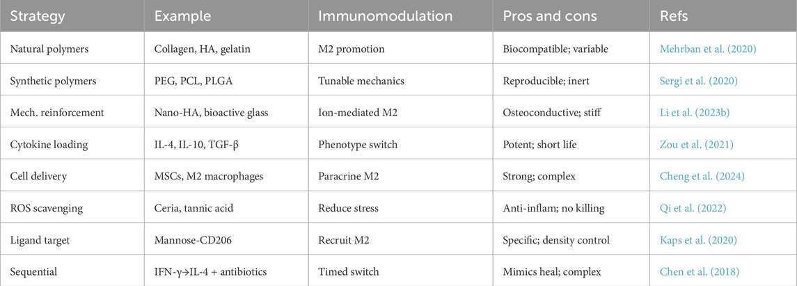 Additionally, the rise of antibiotic-resistant organisms further complicates treatment, as seen with methicillin-resistant S. aureus and other nosocomial pathogens that withstand conventional antibiotics (Li and Webster, 2018). These challenges have spurred interest in innovative therapeutic approaches that not only eliminate infection but also actively promote bone regeneration (Sheehy et al., 2025). One emerging strategy is to harness and modulate the body’s own immune response to create a more favorable healing environment–essentially tipping the balance from chronic inflammation to pro-regenerative immunity (Ko and Lee, 2022). In particular, macrophages have come into focus as key regulators of inflammation and tissue repair. The concept of “immune-informed regeneration” suggests that biomaterials can be engineered to interact with immune cells (such as macrophages) to encourage outcomes that aid tissue repair (Liu and Segura, 2020; Whitaker et al., 2021).