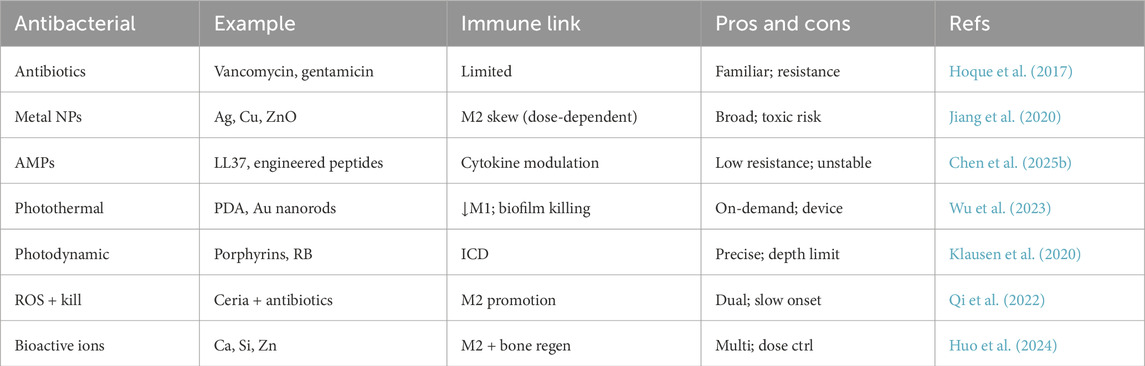 One straightforward approach is loading conventional antibiotics into hydrogels for local release. Local antibiotic delivery achieves high drug concentrations at the infection site without systemic toxicity, and several clinical products already exist (for example, antibiotic-impregnated bone cement or calcium sulfate beads) (Alt et al., 2015). Hydrogels can be advantageous in this context because they are often biodegradable and can fill irregular defects. Antibiotics like vancomycin, gentamicin, tobramycin, and ciprofloxacin have been successfully incorporated into various hydrogel formulations (Shukla and Shukla, 2018; Sun et al., 2024b). For instance, a thermosensitive chitosan-based hydrogel carrying vancomycin nanoparticles was developed to treat bone infections: it remained liquid at room temperature for injectability and gelled at body temperature, releasing vancomycin in a sustained manner to eradicate S. aureus, while the chitosan matrix itself helped modulate the local immune response (Hoque et al., 2017). Importantly, the immunomodulatory hydrogel paradigm emphasizes that simply delivering antibiotics may quell infection, but if the inflammatory environment is not also addressed, healing may still stall (Qi et al., 2024). Therefore, researchers have combined antibiotics with immune cues. For example, several studies have developed hydrogels loaded with interleukin-4 (IL-4) to promote M2 macrophage polarization, which in turn reduces inflammation and accelerates tissue repair. These IL-4-loaded hydrogels have shown promising results in enhancing osteogenesis and bone regeneration (Zou et al., 2021; Zhao et al., 2024; Chen Y. et al., 2025). The timing and release profile are critical: ideally, the antibiotic is released aggressively early on to knock down bacterial counts, whereas the immunomodulator is co-released or slightly delayed to avoid suppressing the initial needed inflammation. Advanced release systems often employ stimuli-responsive mechanisms to achieve this staged delivery (Sikder et al., 2021; Nazir et al., 2022). After the infection is under control, the remaining hydrogel can degrade to release factors that aid healing. The approaches listed provide an overview of antibacterial components integrated into hydrogels and their associated immune-modulating effects (Table 3). Model note: typically rat/mouse segmental-defect osteomyelitis with S. aureus; intralesional delivery after debridement; endpoints include CFU, μCT, and histology.