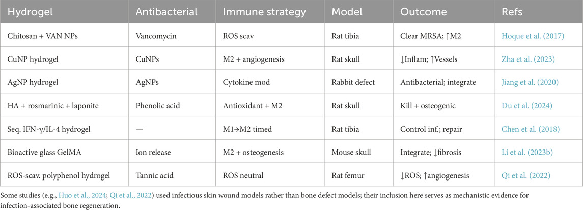 In summary, the design toolbox for immunomodulatory hydrogels is rich and multifaceted. By carefully selecting material composition, mechanical properties, and bioactive payloads, researchers have created hydrogel systems that not only serve as scaffolds for new bone growth but also actively guide the immune processes underlying successful regeneration. These hydrogels aim to recreate the conditions of normal bone healing even in adverse settings–quieting excessive inflammation and encouraging the body’s natural repair machinery. In the context of infection-associated defects, however, an additional key requirement is antimicrobial efficacy. We thus turn our attention to how hydrogels can be equipped to handle bacterial challenges while simultaneously performing immunomodulation. These representative studies illustrate diverse hydrogel designs aimed at modulating immune responses in infected bone defects (Table 2; Figure 2).