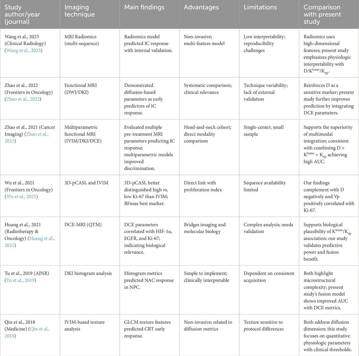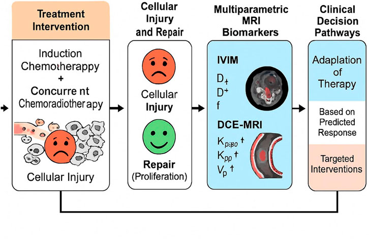 Therapeutic response in NPC reflects a balance between treatment-induced cytotoxicity and subsequent cellular repair (Chen et al., 2019; Luo, 2023). Conventional magnetic resonance imaging (MRI) primarily captures size changes, which occur later than the underlying microstructural and functional alterations. Functional imaging biomarkers that quantify early changes in diffusion, perfusion, and vascular permeability may thus provide earlier and more biologically meaningful insights into treatment response.