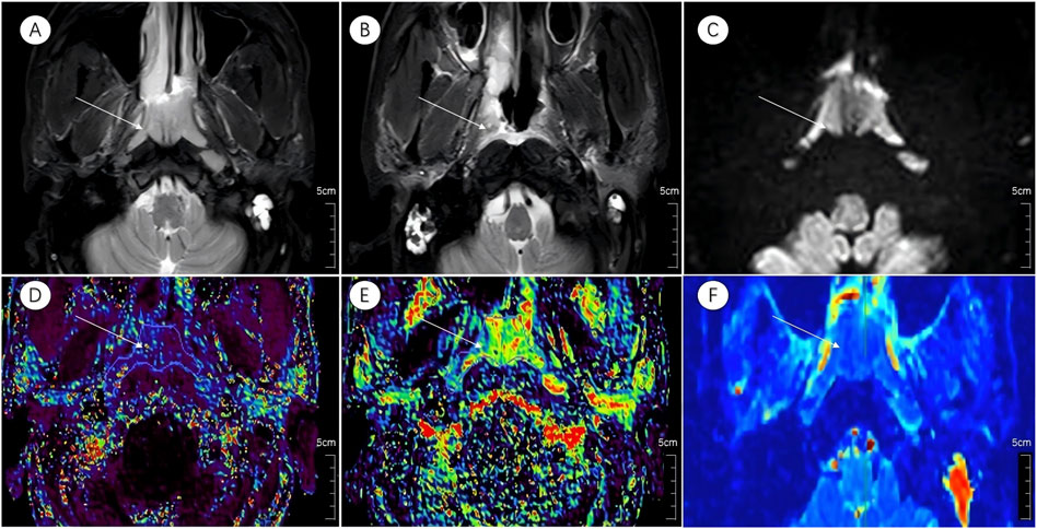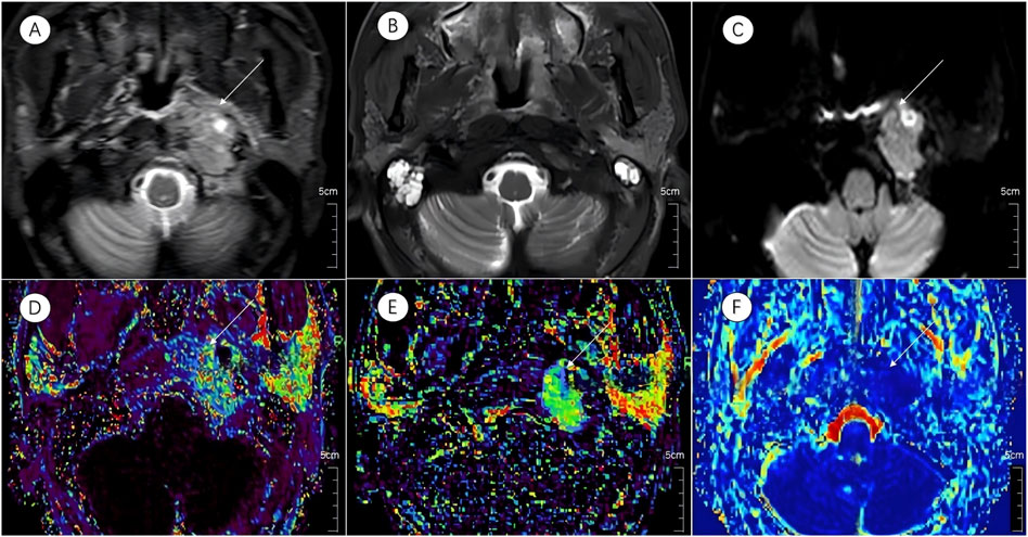 Figure 3. Multiparametric MR images of a representative patient from the incomplete response group. White arrows in the figure indicate lesions. (A,B) Axial T2-STIR images acquired before treatment and at the 6-month follow-up after induction chemotherapy (IC) followed by concurrent chemoradiotherapy (CCRT). Image (B) shows partial residual tumor following treatment. (C) IVIM map of the lesion before treatment.(D–F) Parametric maps of Ktrans, Kep, and D obtained before treatment.