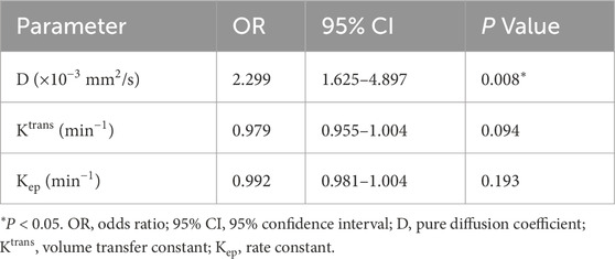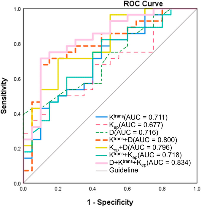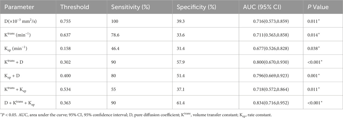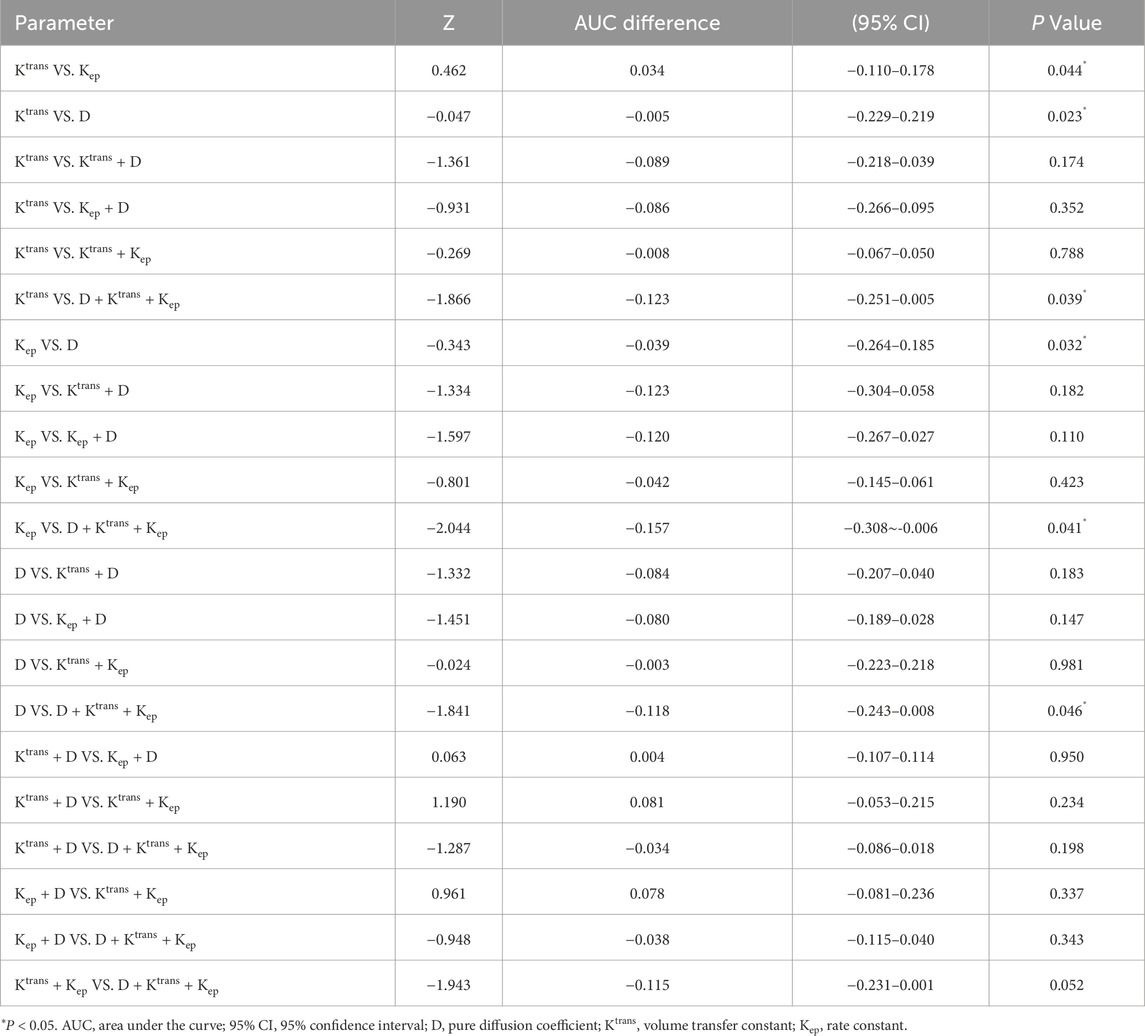 Pairwise comparisons of AUCs were performed using DeLong’s test to determine the statistical significance of performance differences (Table 5). Among individual parameters, Ktrans demonstrated a significantly higher AUC than both Kep (AUC difference = 0.034, P = 0.044) and D (AUC difference = −0.005, P = 0.023). A significant difference was also observed between Kep and D (P = 0.032). Importantly, the three-parameter model D + Ktrans + Kep achieved significantly higher AUCs than any single parameter, including Ktrans (AUC difference = −0.123, P = 0.039), Kep (AUC difference = −0.157, P = 0.041), and D (AUC difference = −0.118, P = 0.046). However, comparisons among combined models revealed no statistically significant differences between D + Ktrans + Kep and either Ktrans + D (AUC difference = −0.034, P = 0.198) or Kep + D (AUC difference = −0.038, P = 0.343). Likewise, Ktrans + D and Kep + D did not differ significantly (AUC difference = 0.004, P = 0.950).