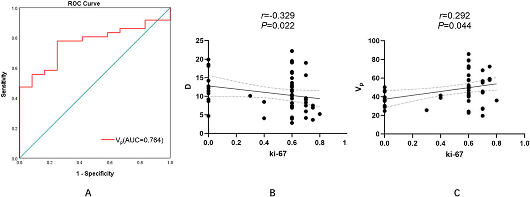 Figure 5. Diagnostic performance and correlations of MRI-derived parameters with tumor proliferative activity (Ki-67 index). (A) ROC curve analysis of the Vp for predicting high Ki-67 expression. The optimal threshold of 0.399 yielded an AUC of 0.764, with a sensitivity of 77.8% and specificity of 52.8%. (B) A moderate negative correlation between D and Ki-67 was observed (r = −0.329, P = 0.022), indicating that lower diffusivity is associated with increased proliferative activity. (C) A positive correlation between Vp and Ki-67 (r = 0.292, P = 0.044), suggesting that higher perfusion correlates with accelerated cellular turnover. (ROC, receiver operating characteristic; AUC, area under the curve; D, pure diffusion coefficient; Vp, plasma volume fraction).