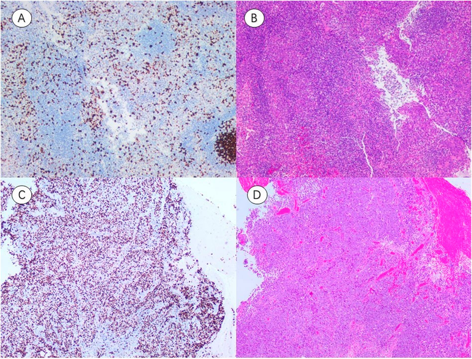 Figure 6. Representative immunohistochemistry (IHC) and hematoxylin–eosin (HE) staining of NPC tissues with different Ki-67 expression levels. (A,B) IHC image Ki-67(LI ≈ 30%) and corresponding HE-stained section from a patient with low Ki-67 expression (A threshold of 50% distinguished low (≤50%) from high (>50%) expression groups). (C,D) IHC image Ki-67(LI ≈ 80%) and corresponding HE-stained section from a patient with high Ki-67 expression (A threshold of 50% distinguished low (≤50%) from high (>50%) expression groups). (IHC, representative immunohistochemistry; HE, hematoxylin–eosin; LI, labeling index).