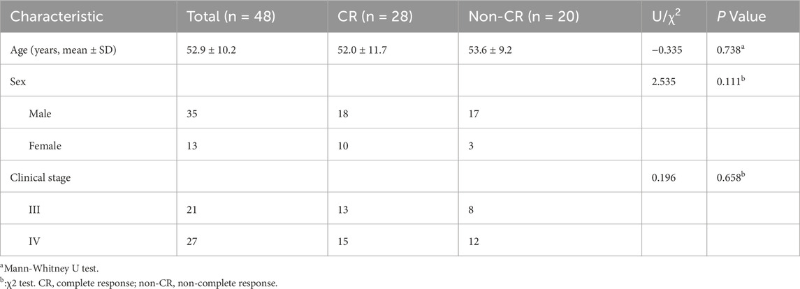 The study included 48 patients diagnosed with NPC, categorized into two groups based on their therapeutic response at 6 months: complete response (CR, n = 28) and non-complete response (non-CR, n = 20). The baseline clinical characteristics of both groups are summarized in Table 1. No significant differences were observed between the groups in terms of age (P = 0.738), sex (P = 0.111), or clinical stage (P = 0.658).