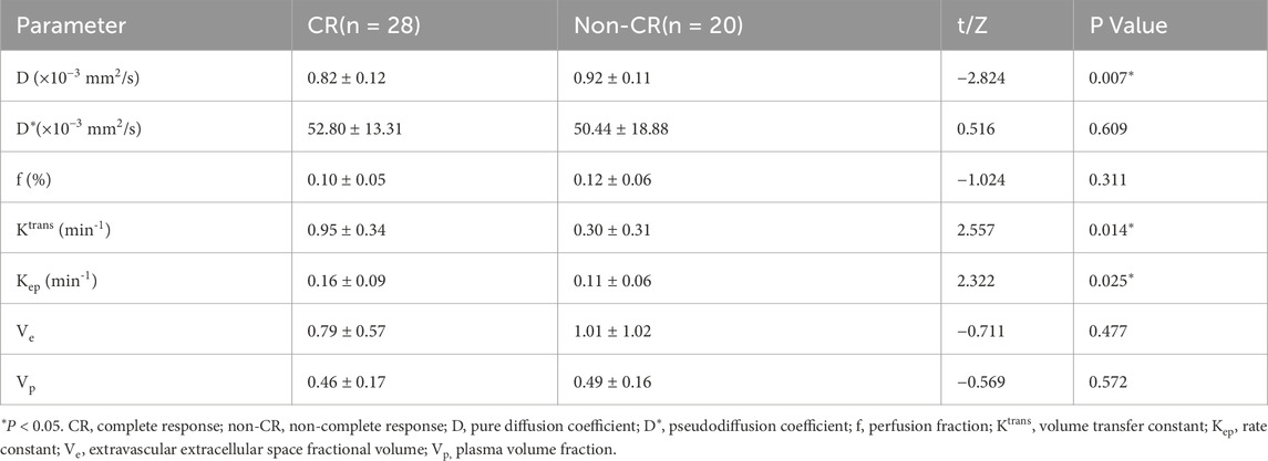 Prior to treatment initiation, the CR group exhibited a markedly lower D than the non-CR group (0.82 ± 0.12 × 10−3 mm2/s vs. 0.92 ± 0.11 × 10−3 mm2/s; t = −2.824, P = 0.007). No significant intergroup differences were detected in the D* or f (P > 0.05 for both). Graphical and tabular data are displayed in Figures 2, 3 and Table 2.