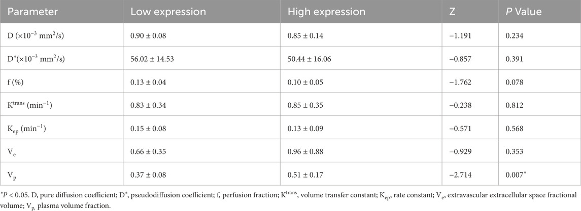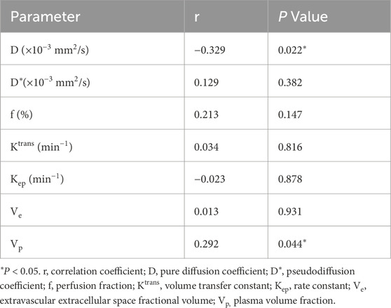 • No significant associations for D*, f, Ktrans, Kep, or Ve (all P > 0.05) (Table 6).