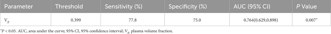 Patients with low Ki-67 expression demonstrated significantly lower Vp values than those with high expression (Z = −2.714, P = 0.007). No other parameter—including D, D*, f, Ktrans, Kep, or Ve—showed statistically significant differences between the subgroups (Z = −1.191, P = 0.234; Z = −0.857, P = 0.391; Z = −1.762, P = 0.078; Z = −0.238, P = 0.812; Z = −0.571, P = 0.568; Z = −0.929, P = 0.353, respectively) (Table 7). For Vp, the ROC curve analysis yielded an AUC of 0.764, with an optimal threshold of 0.399, achieving a sensitivity of 77.8% and specificity of 52.8% (Figure 5A; Table 8).