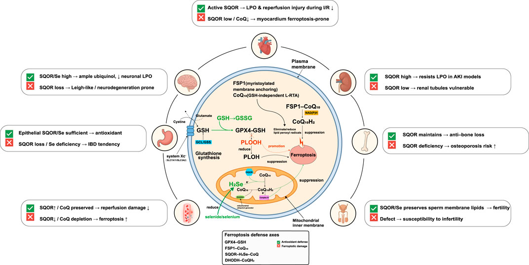 Figure 4. Integrated schematic of the SQOR-H2Se-CoQ-H2axis, classical ferroptosis defenses and context-dependent outcomes. Three lipid-peroxidation defense axes operate in parallel. (1) Cystine/GSH/GPX4 axis: system Xc−(SLC7A11/SLC3A2) imports cystine for glutathione (GSH) synthesis via glutamate-cysteine ligase (GCL) and glutathione synthetase (GSS); glutathione peroxidase 4 (GPX4) uses GSH to reduce phospholipid hydroperoxides (PLOOH) to phospholipid alcohols (PLOH), thereby suppressing ferroptosis. GSH oxidation to GSSG and GSH depletion promote ferroptosis. (2) FSP1-CoQ-NAD(P)H axis: myristoylated ferroptosis suppressor protein 1 (FSP1) at the plasma membrane reduces coenzyme Q10(CoQ10) to ubiquinol (CoQ10H2) using NAD(P)H, providing a glutathione-independent lipophilic radical-trapping antioxidant (L-RTA) that eliminates lipid peroxyl radicals. (3) Mitochondrial SQOR-H2Se-CoQ-H2axis: SQOR on the inner mitochondrial membrane uses hydrogen selenide (H2Se) to reduce CoQ to CoQH2, collaborating with dihydroorotate dehydrogenase (DHODH) and electron flow from Complex III to maintain mitochondrial CoQH2and suppress lipid peroxidation independently of GSH/GPX4. Organ-specific outcomes depend on SQOR/selenium/coenzyme Q availability: in the brain, high SQOR and selenium provide ample ubiquinol and low neuronal lipid peroxidation, whereas SQOR loss predisposes to Leigh-like neurodegeneration; in the heart, active SQOR reduces lipid peroxidation and reperfusion injury during ischemia-reperfusion (I/R), whereas SQOR downregulation or CoQ depletion makes myocardium prone to ferroptosis; in the kidney, high SQOR expression resists lipid peroxidation in acute kidney injury (AKI) models, whereas low expression renders renal tubules vulnerable; in the gut, epithelial SQOR/selenium sufficiency provides antioxidant protection, whereas SQOR loss or selenium deficiency leads to inflammatory bowel disease (IBD) tendencies; in bone, SQOR maintains bone mass and deficiency increases osteoporosis risk; in the male reproductive system, SQOR/selenium preserves sperm membrane lipids and fertility, whereas defects lead to infertility. SQOR, sulfide:quinone oxidoreductase; H2Se, hydrogen selenide; CoQ, coenzyme Q; CoQH2, ubiquinol; GPX4, glutathione peroxidase 4; GSH, glutathione; GSSG, oxidized glutathione; FSP1, ferroptosis suppressor protein 1; NAD(P)H, nicotinamide adenine dinucleotide (phosphate); DHODH, dihydroorotate dehydrogenase; PLOOH, phospholipid hydroperoxide; PLOH, phospholipid alcohol; LPO, lipid peroxidation; L-RTA, lipophilic radical-trapping antioxidant; I/R, ischemia-reperfusion; AKI, acute kidney injury; IBD, inflammatory bowel disease.
