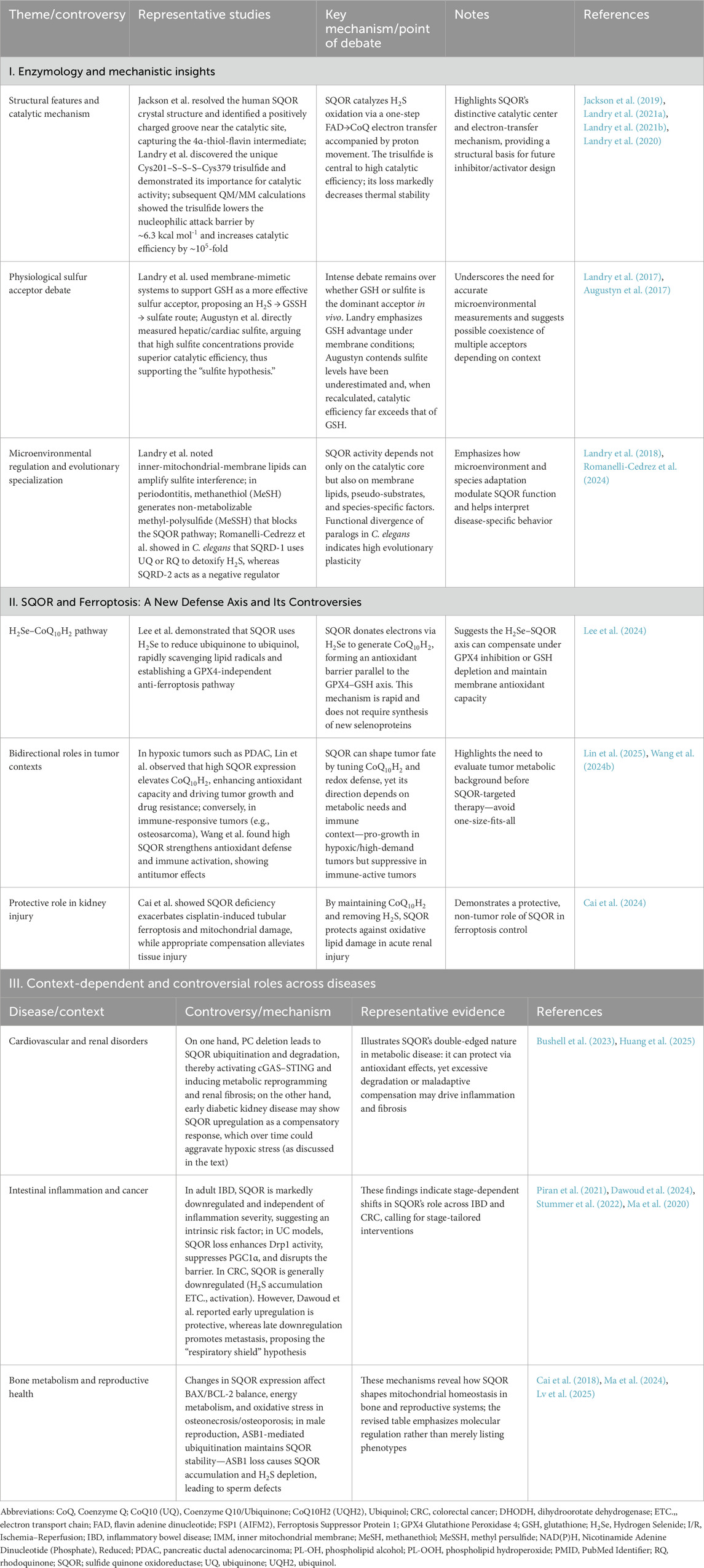 Table 1. SQOR and ferroptosis defense: Mechanistic insights, controversies, and context-dependent disease roles.