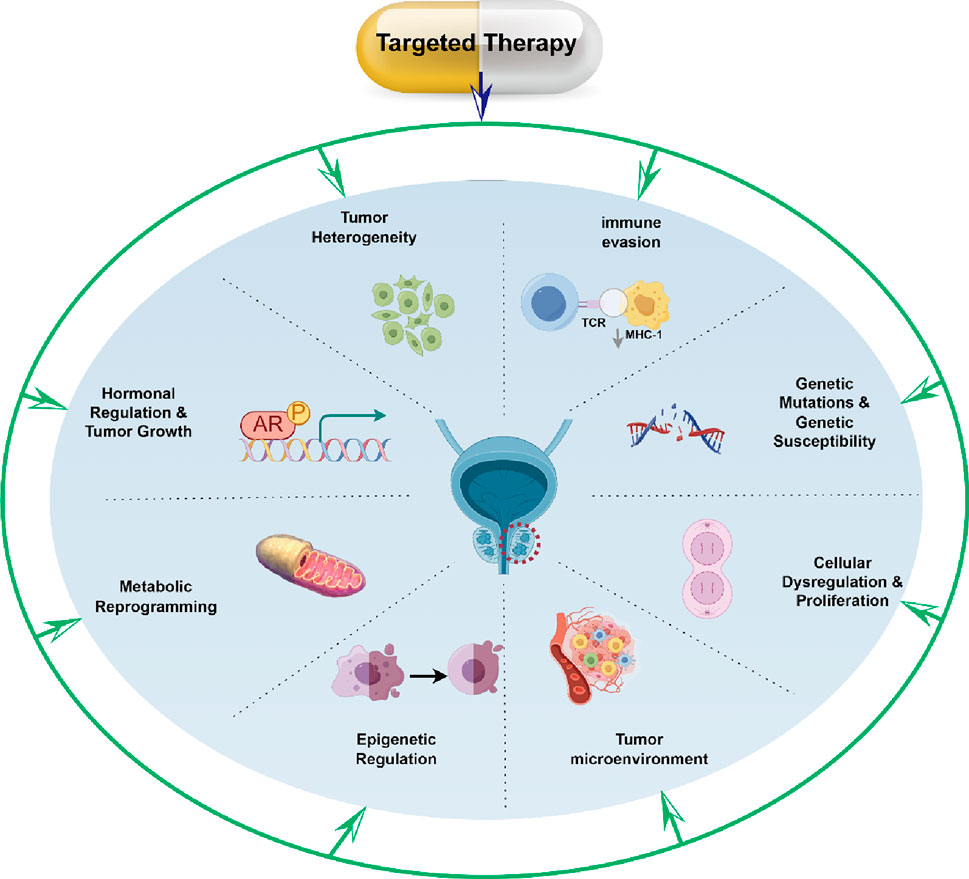 Targeted therapy, an innovative oncologic strategy, operates through precise identification and engagement of tumor-specific molecular targets, diverging from conventional therapies that indiscriminately affect rapidly dividing cells. This approach offers superior selectivity, minimized off-target toxicity, and enhanced therapeutic precision (Qian et al., 2020; Pham et al., 2021; Viktorsson et al., 2023). The advent of targeted therapies has contributed to a shift in oncology—from traditional histology-driven chemoradiotherapy paradigms to molecularly informed personalized approaches. Building on this framework, this review synthesizes recent advancements in PCa-targeted therapeutics, encompassing molecular pathogenesis, contemporary pharmacologic agents, and innovative strategies, while providing a critical appraisal of persistent challenges and emerging countermeasures in this rapidly evolving field.