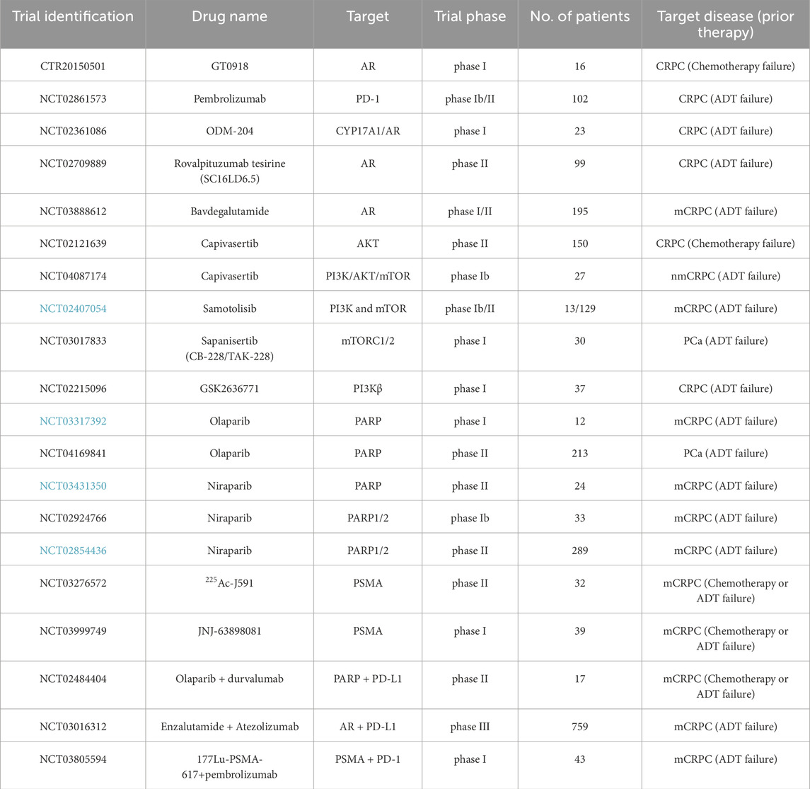 The PI3K/AKT/mTOR pathway, a critical oncogenic cascade, drives PCa progression by promoting tumor cell proliferation, migration, and therapeutic resistance through aberrant activation (Pungsrinont et al., 2021; Wylaź et al., 2023; Yi et al., 2023). Multiple PI3K, AKT, and mTOR inhibitors have entered clinical trials, demonstrating variable antitumor efficacy. Emerging next-generation inhibitors aim to enhance therapeutic precision while minimizing adverse effects.