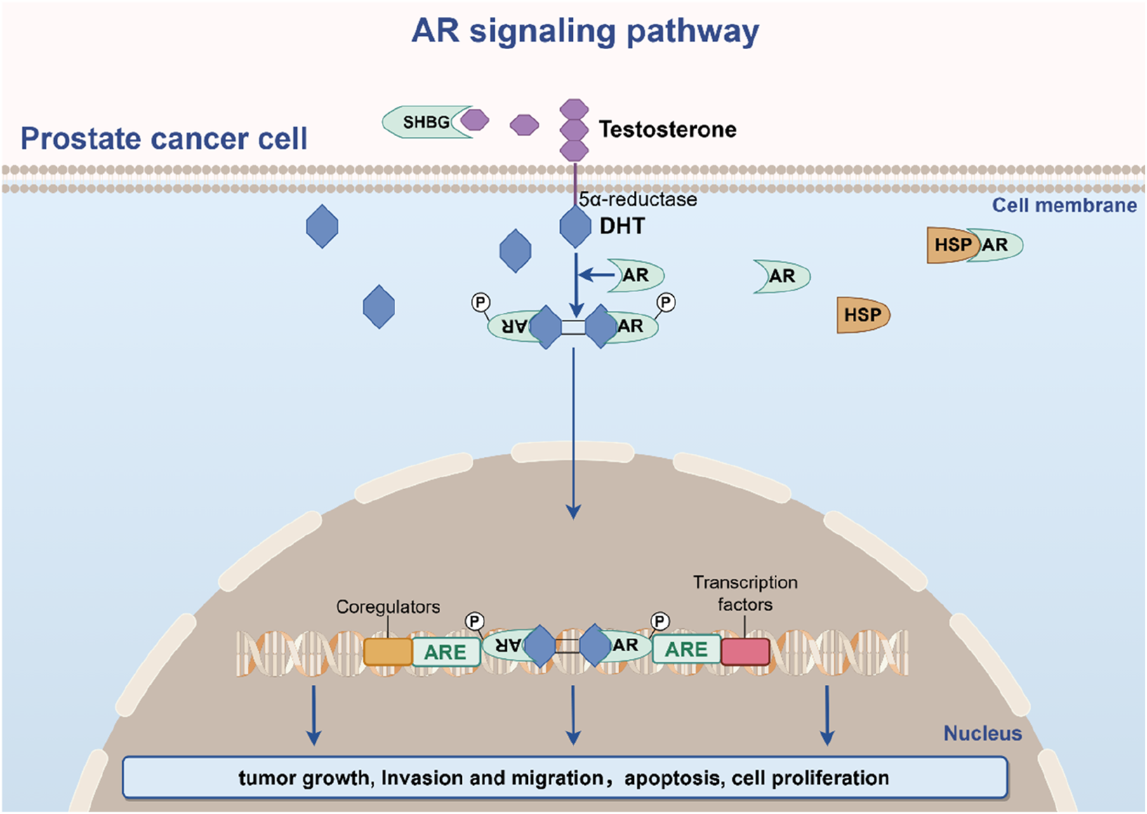 Androgen signaling, mediated via the androgen receptor (AR), remains central to PCa biology (Figure 2). Testosterone and its potent metabolite dihydrotestosterone (DHT) bind AR, a steroid receptor comprising four domains: N-terminal transcriptional regulation, DNA-binding, hinge, and ligand-binding. In unliganded states, AR resides in the cytoplasm, chaperoned by HSP90/70 complexes (Likos et al., 2022; Knerr et al., 2023). Ligand binding triggers conformational changes, nuclear translocation, dimerization, and DNA binding to androgen response elements, driving transcription of genes that promote proliferation, survival, and metastasis (Xie et al., 2022; Özturan et al., 2022; Sun et al., 2023).