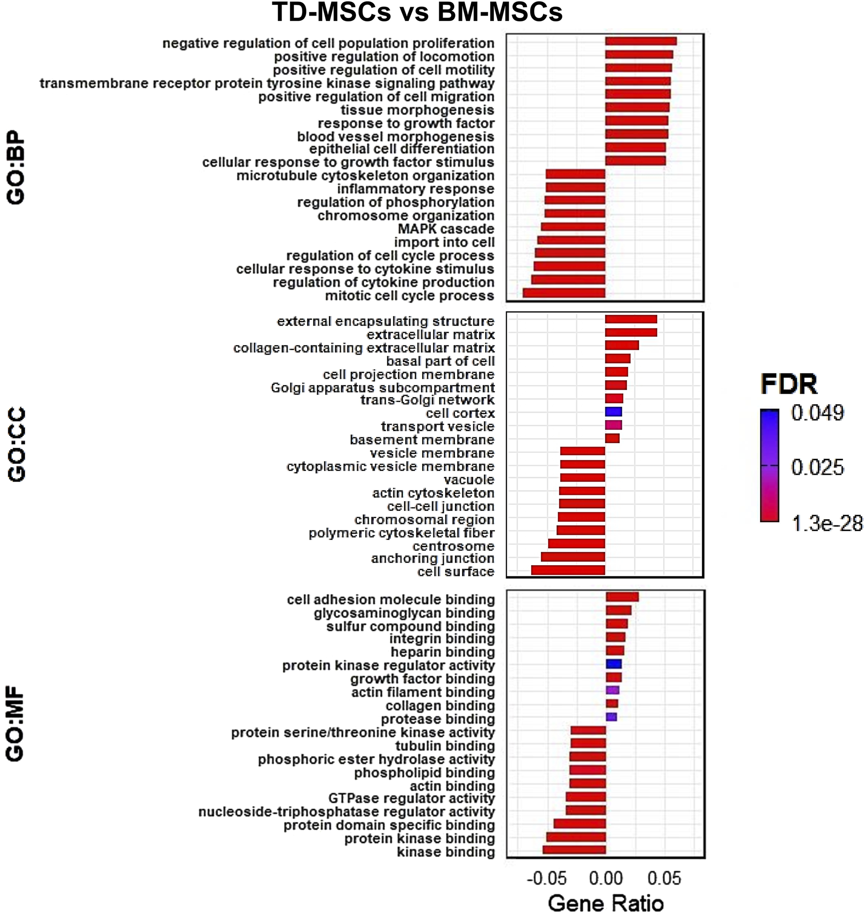 Figure 3. RNA-seq GO transcriptomic comparison of TD-MSCs and BM-MSCs. (A) GO enrichment analysis of DEGs, highlighting top enriched terms in biological processes (BPs), cellular components (CCs), and molecular functions (MFs) for TD-MSC vs. BM-MSC group comparison (bars represent the gene ratio, colored by FDR significance), n = 3 per group.