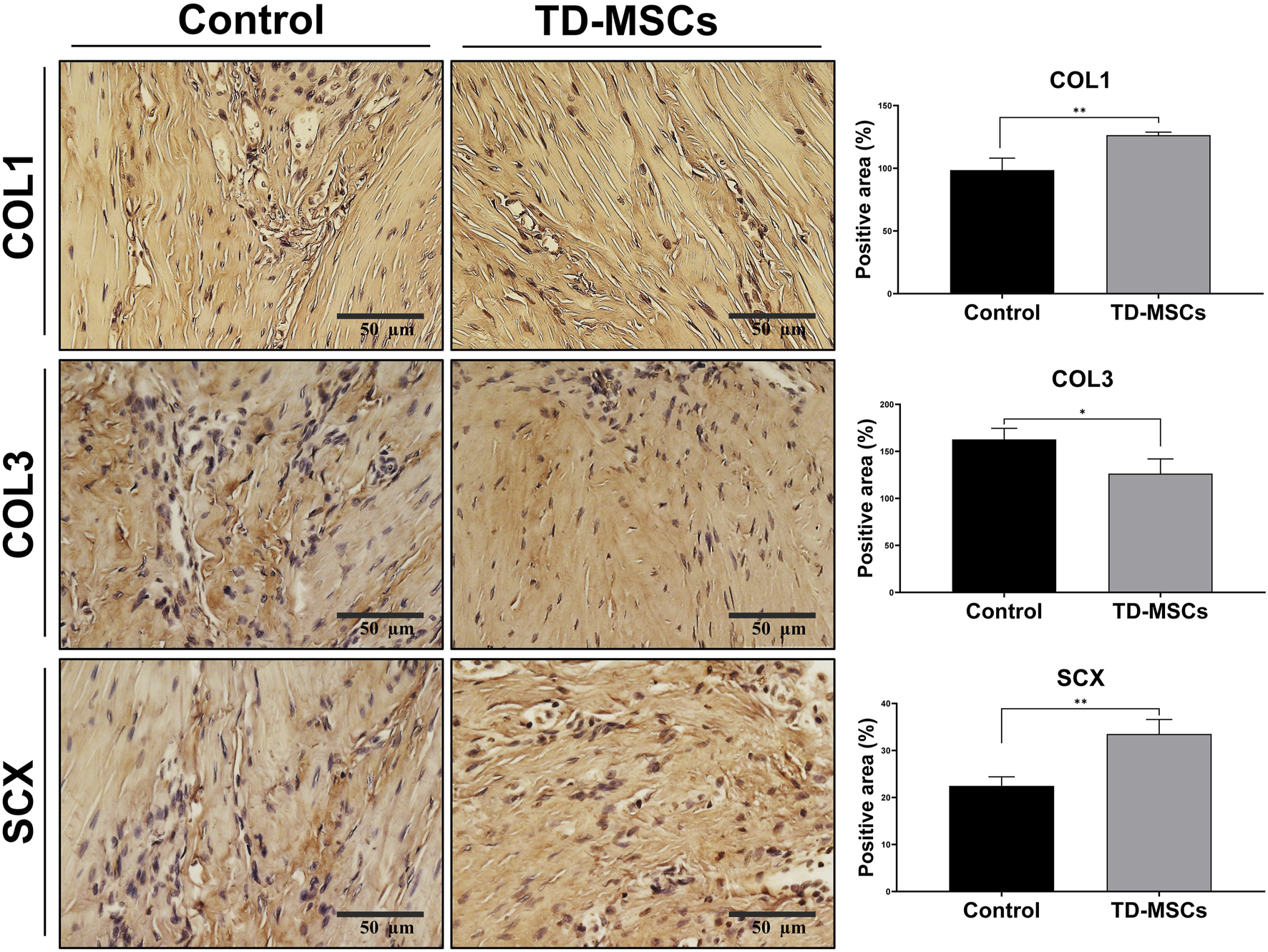 Figure 7. Immunohistochemical evaluation of tendon regeneration markers. Representative IHC images for COL1, COL3, and SCX expression from untreated control and TD-MSC-treated tendons (scale bar: 50 µm), with corresponding quantitative analysis. Data are presented as the mean ± SD (n = 4 animals/group; 3 fields/animal); *p < 0.05, and **p < 0.01.