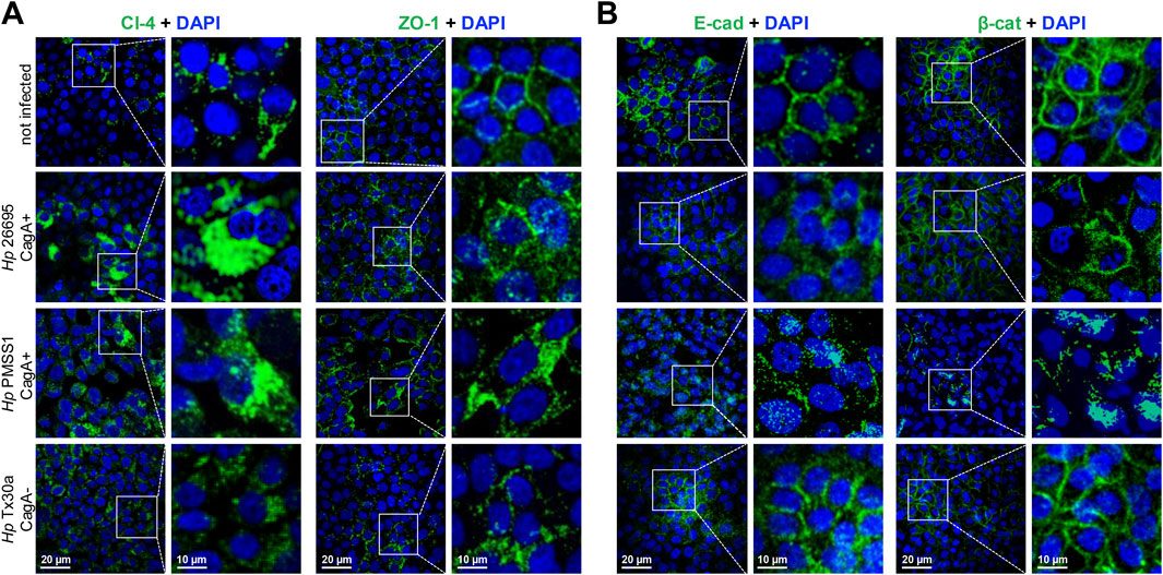 Figure 4. Localization of TJ and AJ proteins in BxPC-3 cells infected by H. pylori. Pancreatic cells were infected with different bacterial strains during 24 h and then processed using immunofluorescence assays, with specific antibodies against TJ (A) and AJ (B) proteins. Nuclei were counterstained with DAPI. Selected regions are shown at higher magnification in the right panels.