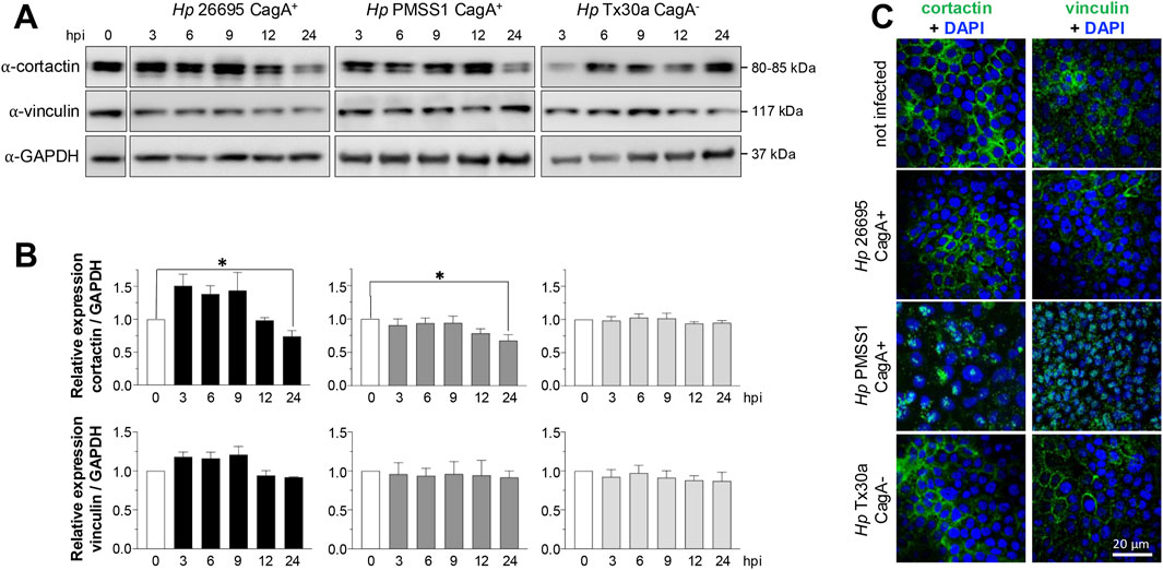 Contrasting to cortactin and similar to actin, vinculin expression remained unchanged at all time points and under all infection conditions (Figures 6A,B). Consistent with actin, the subcellular localization of cortactin and vinculin was also affected by infection. Both proteins were redistributed from the plasma membrane toward the nuclei, particularly in cells infected with the PMSS1 strain. This effect was less pronounced in cells infected with the 26695 CagA+ and Tx30a CagA– strains (Figure 6C).